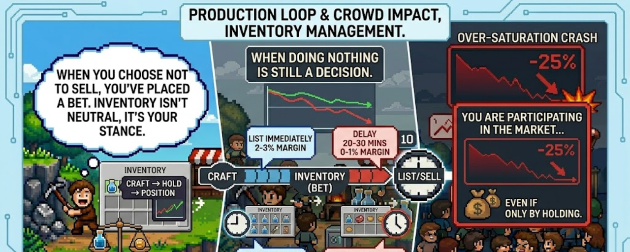 the moment you choose not to sell, you’re already exposed to whatever the market does next. you’re not “waiting,” you’re effectively betting on short-term price movement. and the tricky part is, it doesn’t feel like a bet. there’s no chart, no clear signal, no moment where the game tells you you’re taking on risk. it just sits there quietly, like unused items.