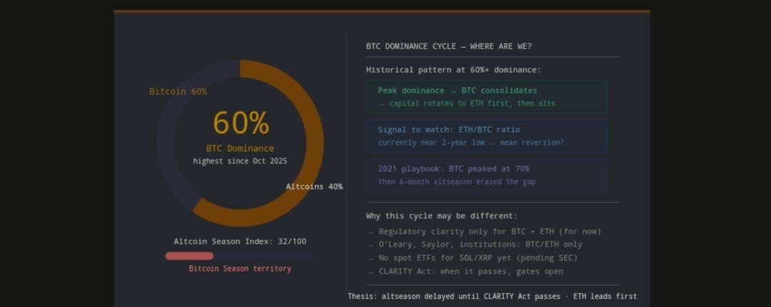 Spot ETFs exist only for BTC and ETH. Regulatory clarity under the CLARITY Act has been granted to BTC, ETH, and a handful of named assets — but the full framework isn't law yet. Institutional allocators — the new dominant force — are largely mandate-constrained to BTC and ETH until more assets receive explicit regulatory treatment.This is why O'Leary's altcoin exit makes structural sense. The capital that drove previous altseasons was retail speculation. The capital driving markets in 2026 is institutional — and institutional money needs compliance frameworks that most altcoins don't yet have.The thesis: altseason is delayed, not dead. When it comes, ETH leads first. The trigger is the CLARITY Act passing and SOL/XRP spot ETFs receiving approval. Until then, BTC at 60% dominance isn't a signal to pile into altcoins. It's a signal to watch ETH/BTC ratio for the first signs of rotation — and that ratio is currently near a 2-year low.ETH before alts. CLARITY before both.
