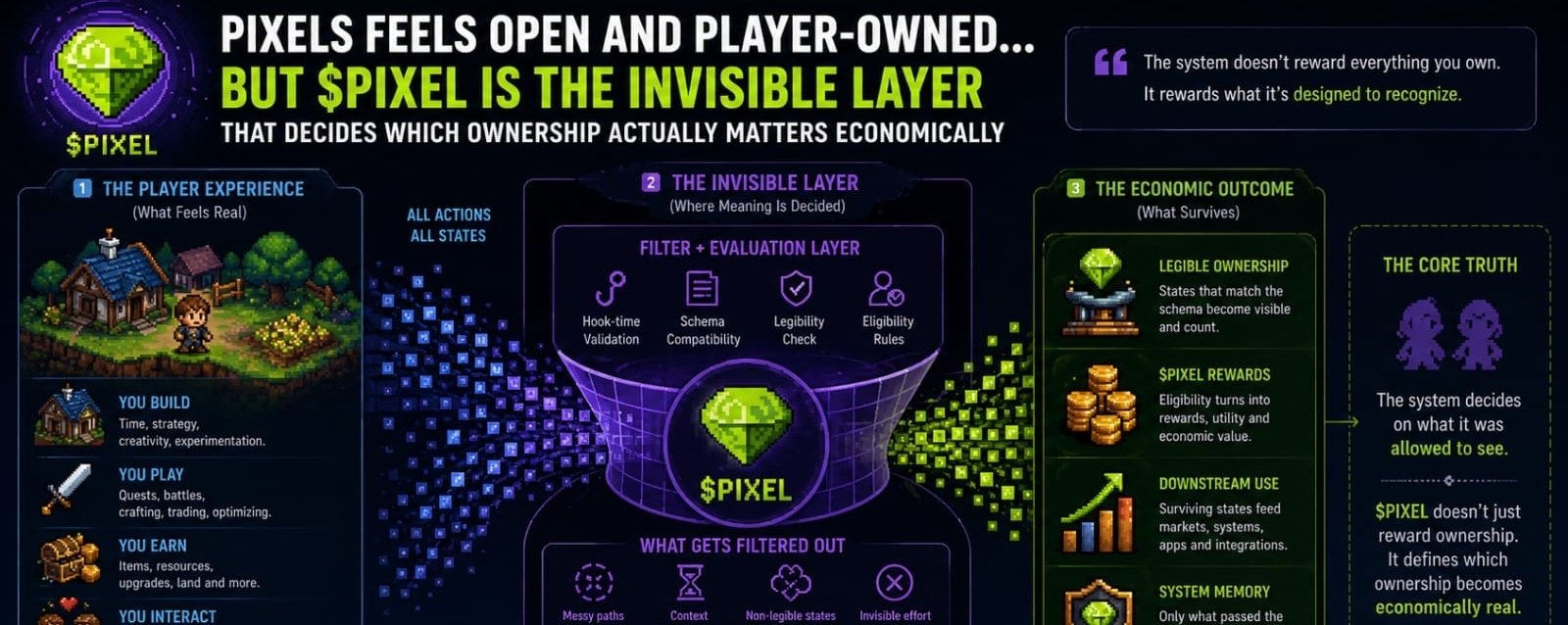 É aqui que $PIXEL começa silenciosamente a desempenhar um papel, não como um sistema de recompensa barulhento ou óbvio, mas como algo que se aproxima da estrutura do movimento em si. Não exige atenção. Não força decisões. Não anuncia constantemente sua importância. Em vez disso, influencia quão suave ou lenta certas partes do sistema se sentem quando você interage com elas. Você pode ignorá-lo e ainda participar plenamente, mas o que você experiencia é uma versão mais básica do ritmo do sistema.
