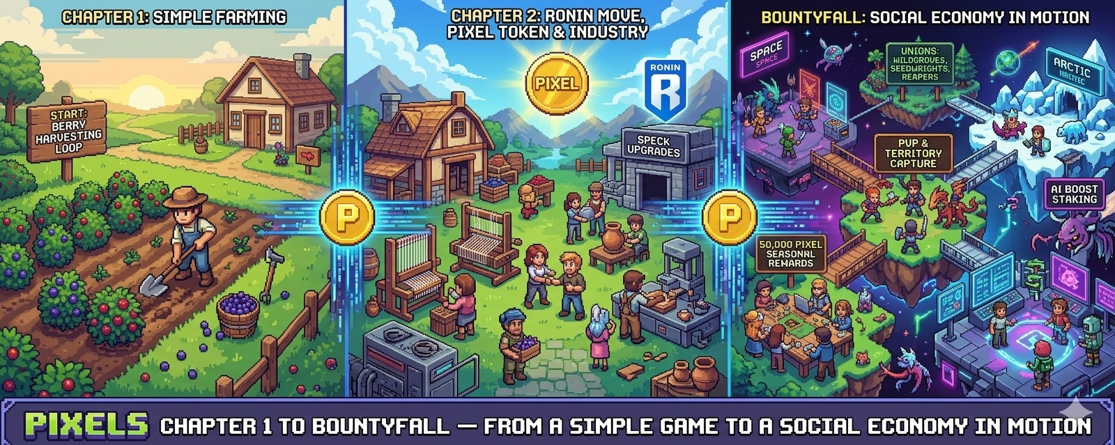 When I think about @Pixels , I do not see just a game timeline. I see a strange kind of evolution, something that starts off looking light, familiar, even harmless, and then slowly begins to feel much bigger than what it first appeared to be. At the beginning, everything was simple in the most convincing way. Chapter 1 was farming, land, and that Berry-style earning loop that made the whole thing easy to understand from the outside. You clicked, collected, returned, repeated. Nothing looked complicated, and maybe that is exactly why it worked. It had the kind of simplicity that quietly turns into habit, and for many players it became more than a game session. It became a routine, a rhythm, almost a small part of daily behavior.