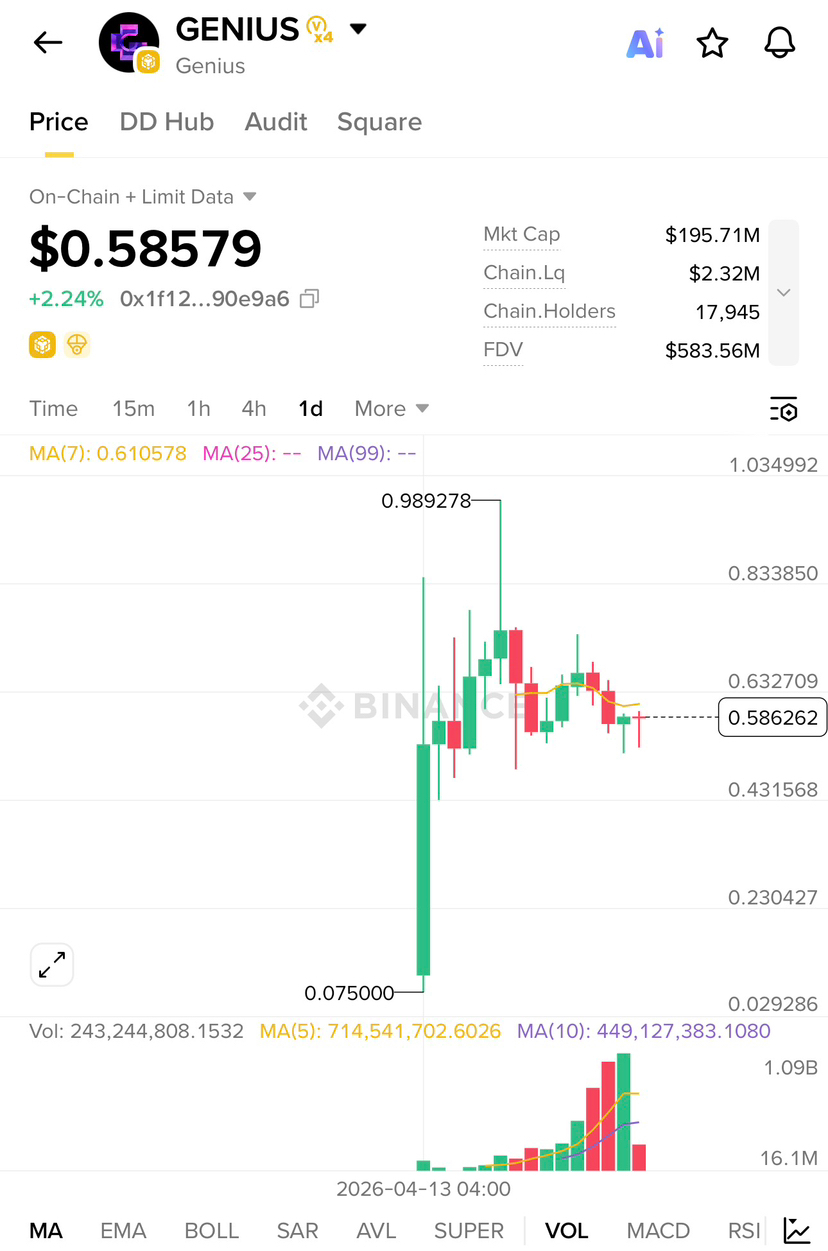 The $GENIUS has recently captured significant attention in the crypto market after delivering an explosive rally from approximately $0.07 to nearly $1.00 in a very short time. Currently trading around the $0.58 level, the asset appears to be stabilizing after its rapid ascent, signaling a classic consolidation phase. With a market capitalization hovering near $195 million and a growing holder base of over 17,000 wallets, GENIUS is showing signs of strong community interest and sustained investor engagement. This cooling-off period is not uncommon following such aggressive upward movements, as early investors take profits while new participants look for entry points. The current price structure suggests that the token is forming a base between the $0.55 and $0.65 range, which could act as a launchpad for its next major move if buying pressure continues to build.
