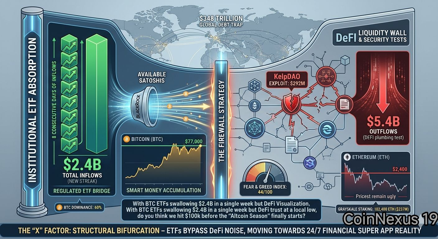 $ETH : Sentiment is currently split. While price stays "ugly" below the $2,400 level, Grayscale just staked 102,400 ETH ($237M) into its Mini Trust. However, a recent $292M exploit on KelpDAO triggered $5.4B in outflows, testing the market's internal plumbing.