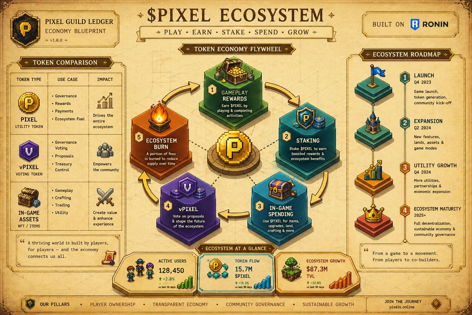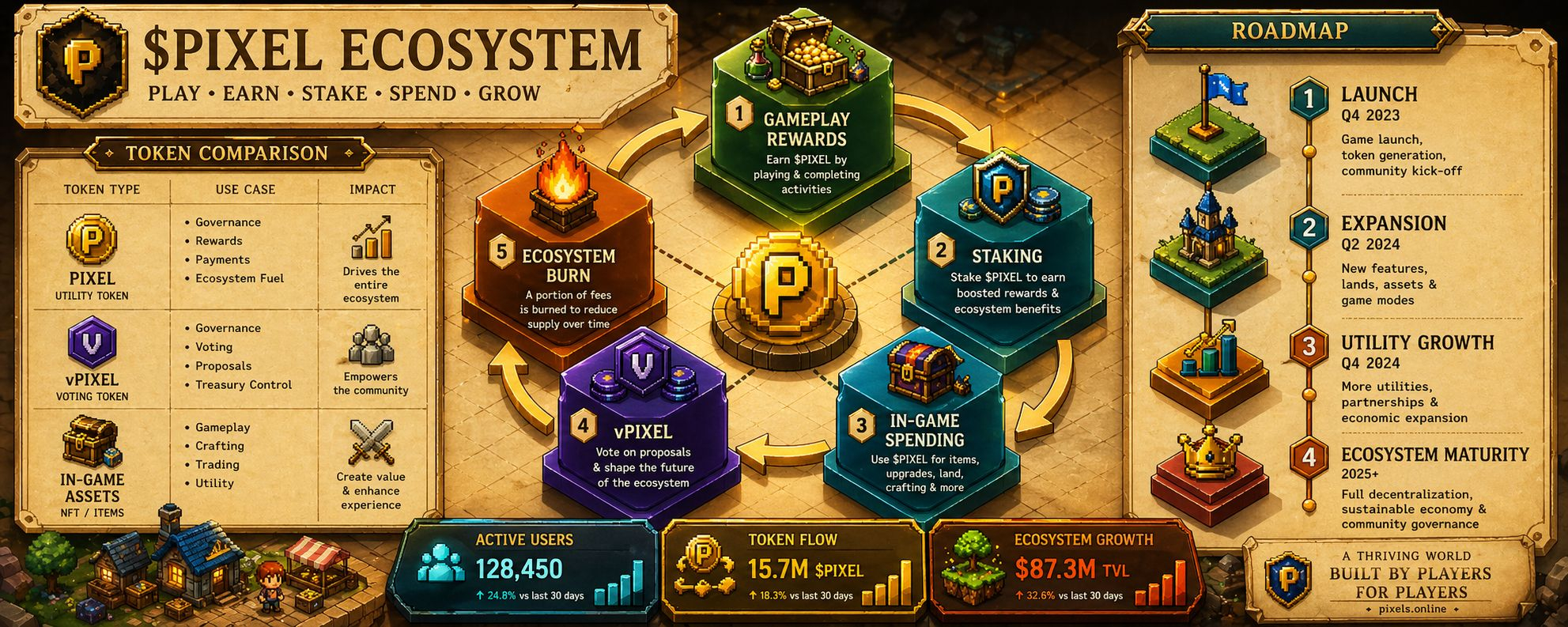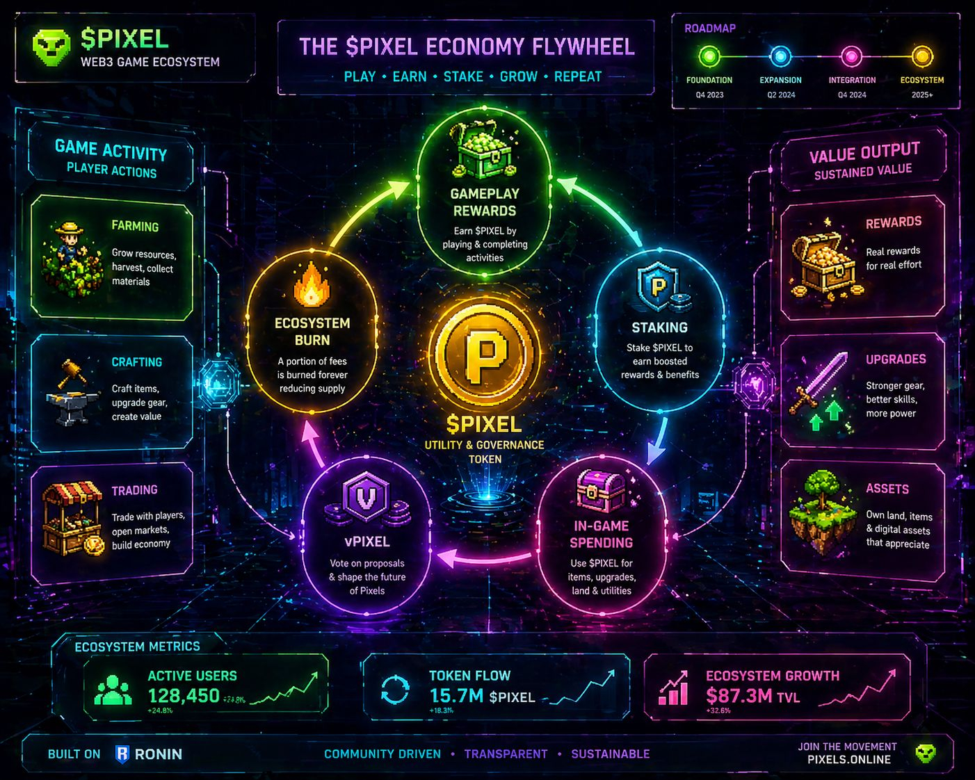 What makes this genuinely different from older play-to-earn models is the introduction of $vPIXEL — a fee-free spend-only token designed to reward active in-game participants without flooding the market. Players who want to withdraw directly as pixel pay a Farmer Fee (20–50%), which gets redistributed back to stakers. This creates a powerful flywheel: play more, earn $vPIXEL, spend in-game, or stake to compound rewards.