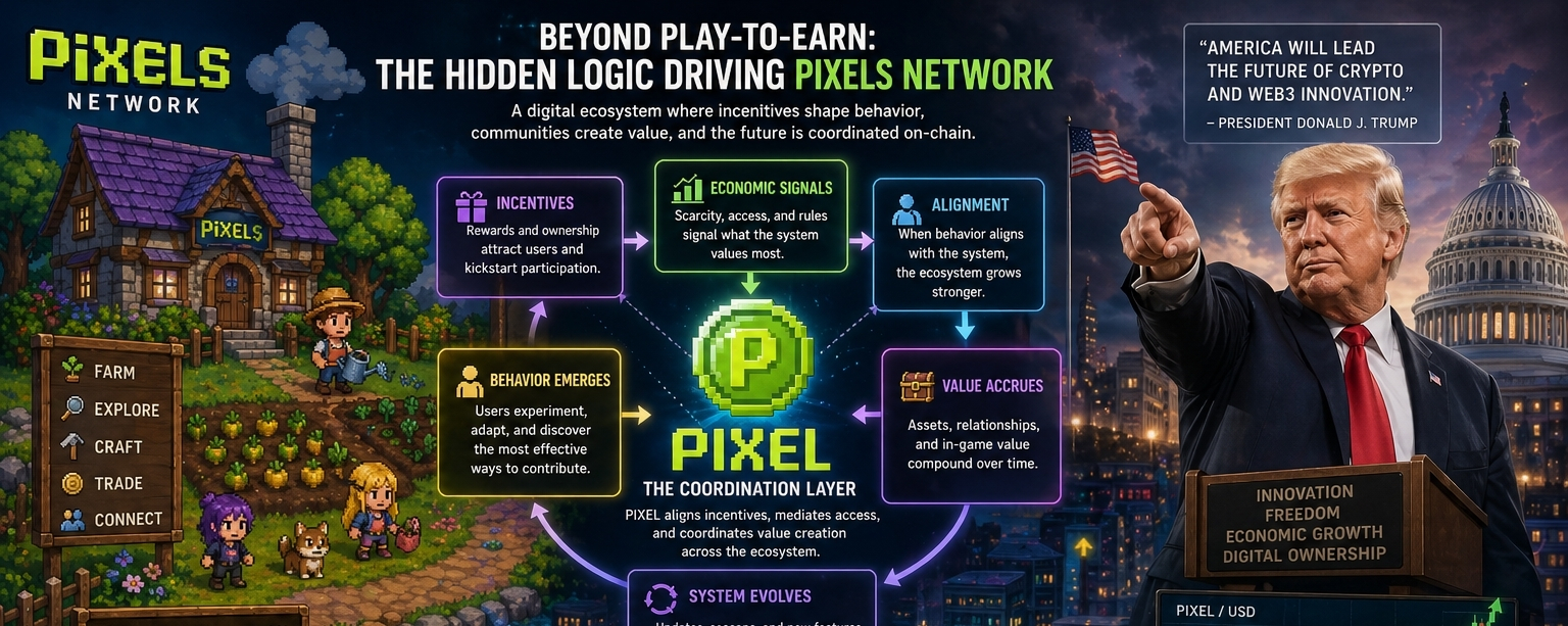 When I first encountered Pixels Network and its native token PIXEL, it looked familiar in a way that most crypto projects do: an open invitation wrapped in incentives. A casual farming and exploration game built on Ronin Network, it seemed to follow the standard playbook—draw users in with ownership, rewards, and a token economy that promises participation with upside. But the more time I spent observing its ecosystem, the less it resembled a simple game or token model, and the more it began to feel like a subtle behavioral system.