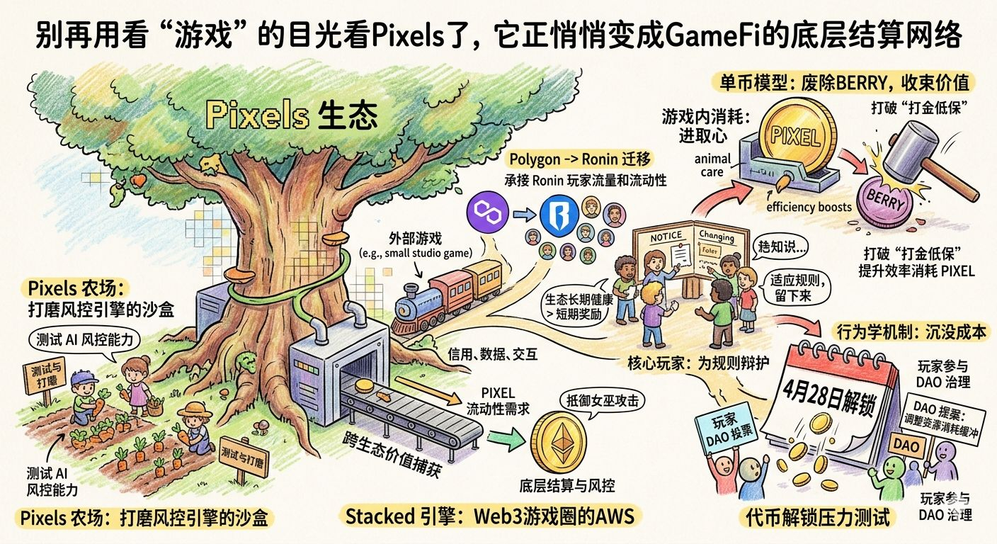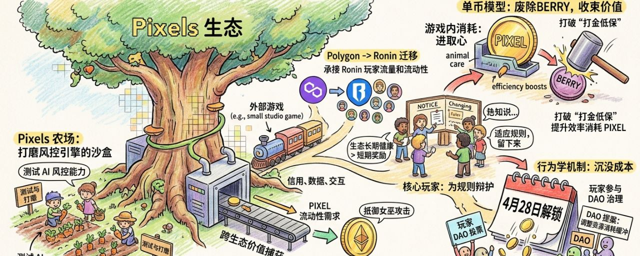 Let's talk about the adjustments in BERRY and the single-token model. Most GameFi projects like to use dual tokens: one main token to pull liquidity and one sub-token for rewards. It sounds great, but they often face severe inflation pressure in the end. The Pixels team's solution is straightforward: proportionally convert BERRY to PIXEL, abolish the unlimited issuance of the sub-token, and consolidate all value into a single token. I spent time testing the animal care system, pulled data to build a model, and found that the output pressure was indeed significant before the adjustment. After the adjustment, the 'gold farming infinite safety net' model was disrupted, shifting the ecosystem towards a more concentrated value game. Plus, migrating from Polygon to Ronin captured the traffic from Ronin's native players and more concentrated liquidity, making the single-token model cleaner and easier for big money to participate. Now, when you play Pixels, you can clearly feel that to boost efficiency, you need to spend PIXEL. The system directly converts your 'ambition' into fuel for maintaining the value of the single currency.