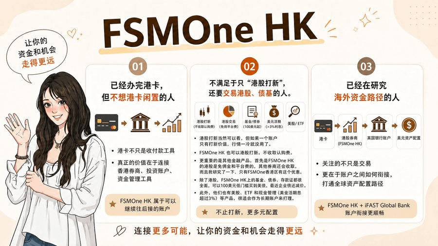 But if you have completed the Hong Kong card and are starting to seriously build your Hong Kong stock/overseas asset account system, then the combination of FSMOne HK + iFAST Global Bank is worth a separate look.
