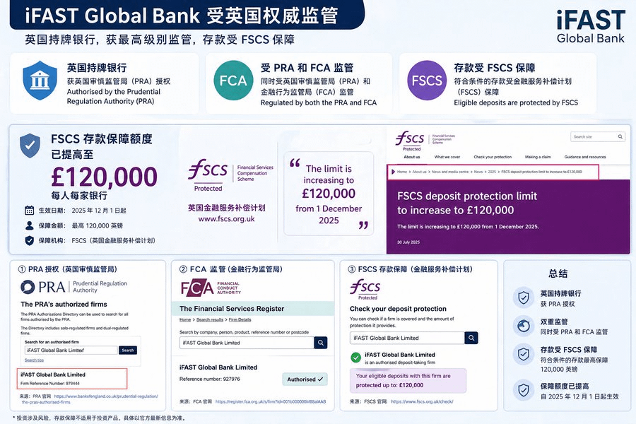According to official information from iFAST Global Bank, it is a UK-regulated bank, authorized by PRA, and supervised by PRA and FCA; eligible deposits are protected by FSCS, and the UK FSCS deposit protection limit has been raised to £120,000 per person per bank from December 1, 2025.