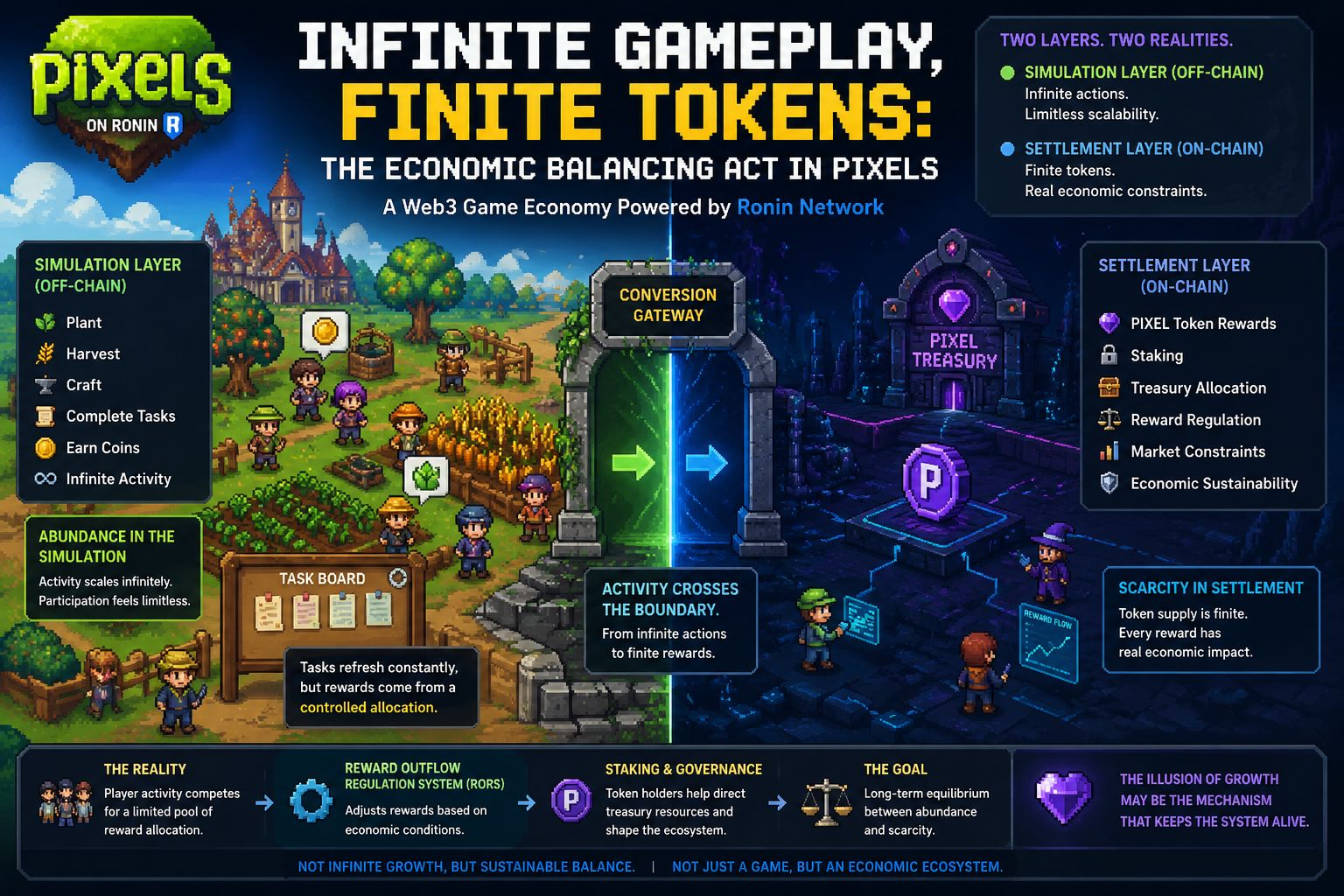 This boundarybetween infinite gameplay activity and finite token settlementis where the true mechanics of the ecosystem become visible.