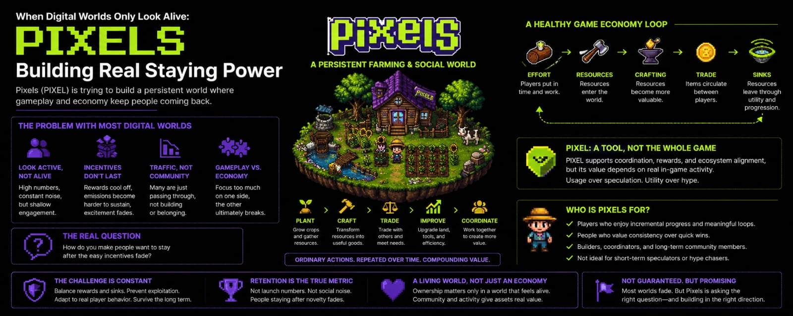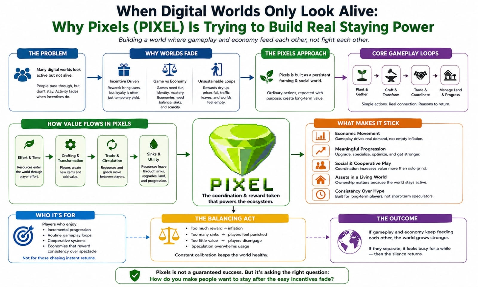I would not call the outcome guaranteed. Most game economies eventually drift out of balance, sometimes slowly enough that people notice too late. But Pixels at least appears to be asking the right question: how do you make people want to stay after the easy incentives fade? If gameplay and economy continue feeding each other instead of competing, this might work. If they separate, it will look busy for a while and then familiar silence returns.$PIXEL
