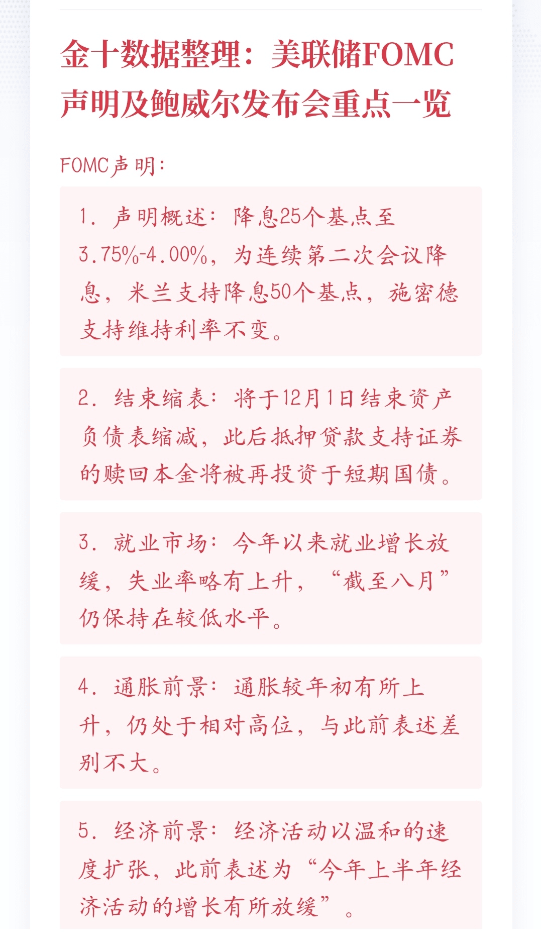 For the second consecutive time, the interest rate is lowered to 3.75%-4.00%, indicating that the Federal Reserve continues to ease monetary policy.