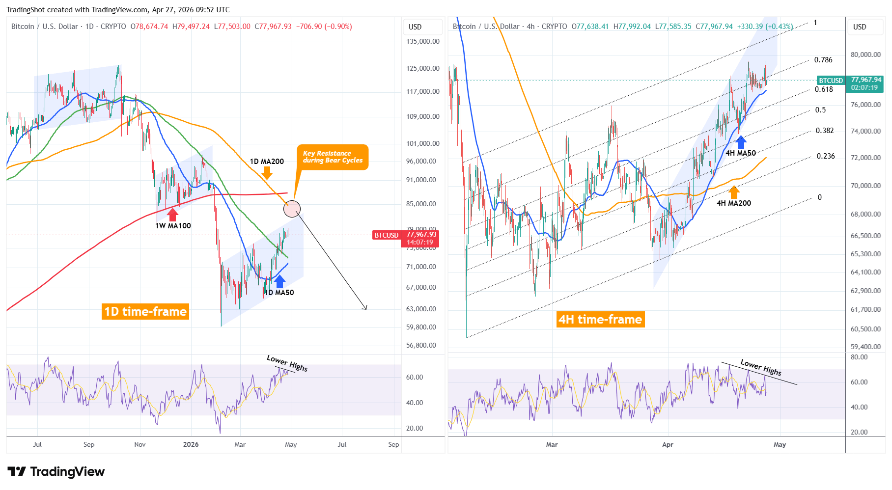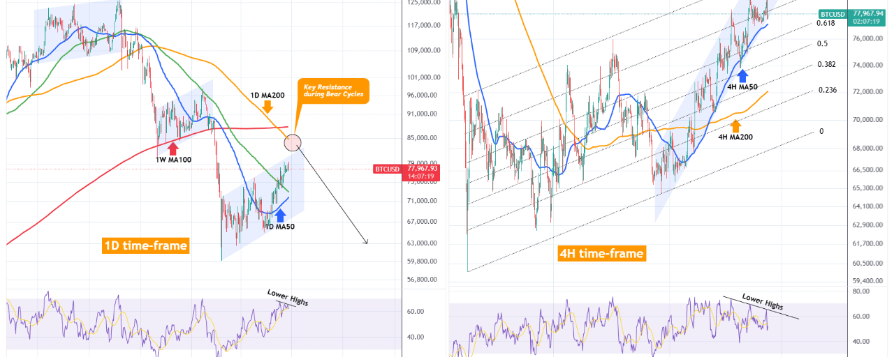 The presence of RSI Lower Highs both on the 1D and 4H charts, should make us skeptical. On 4H and the even shorter Channel Up (blue) that was initiated after the March 30 Low, the 4H MA50 (blue trend-line) is what's holding the pattern from a correction below the 0.236 Channel Fibonacci level. Critical days for the Cycle as a whole ahead of us.