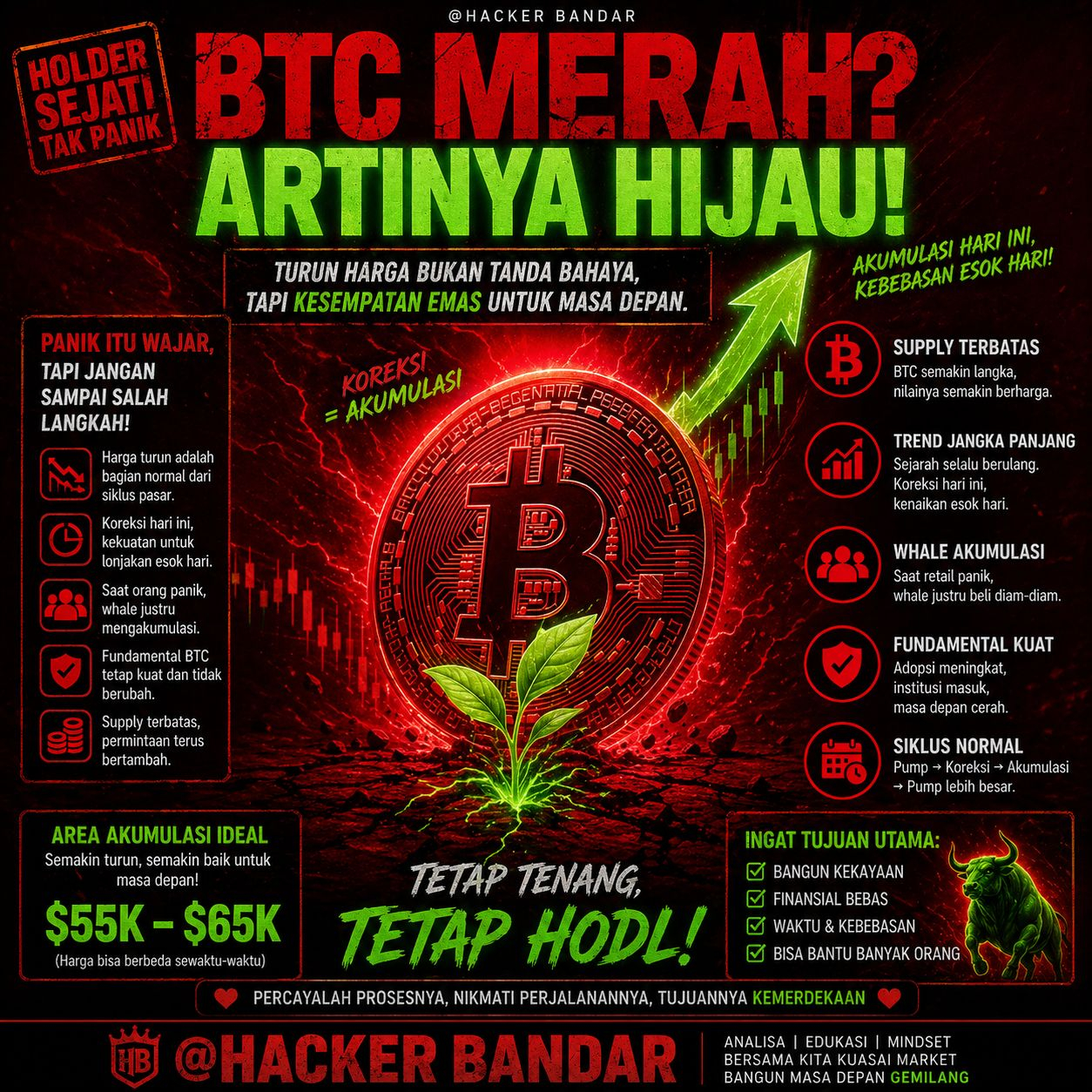 Kesimpulannya, BTC merah saat ini lebih cocok dianggap sebagai zona akumulasi sehat, bukan awal bearish besar. Kepanikan biasanya terjadi di bawah, sementara akumulasi dilakukan secara diam-diam oleh pemain besar. Fokus jangka panjang tetap pada tren besar, bukan fluktuasi pendek.