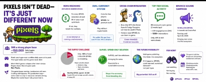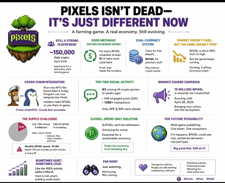 Most Web3 games fall off a cliff after the token dumps. Players leave. Discord goes quiet. You know the pattern. But Pixels still has around 150,000 people logging in daily as of April 2026. That’s not nothing. That’s actually kind of impressive for a farming game that looks like it belongs on a Game Boy.