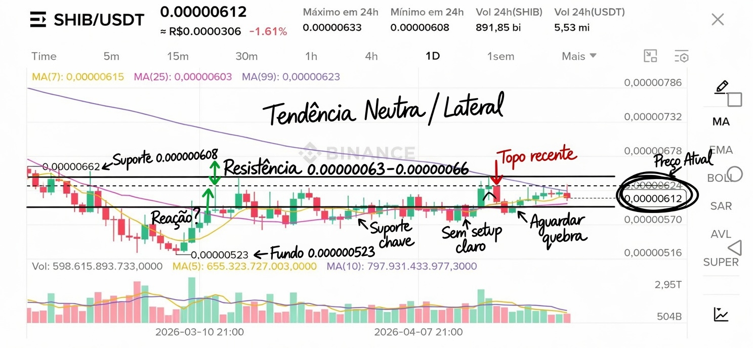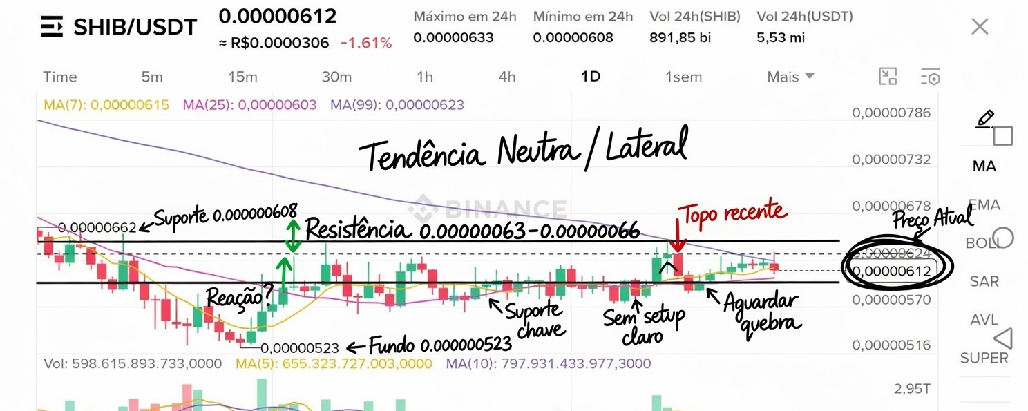 On the 1D chart of SHIB/USDT, the price is at 0.000000612 (-1.61% in the last 24h), ranging between a low of 0.000000608 and a high of 0.000000633.