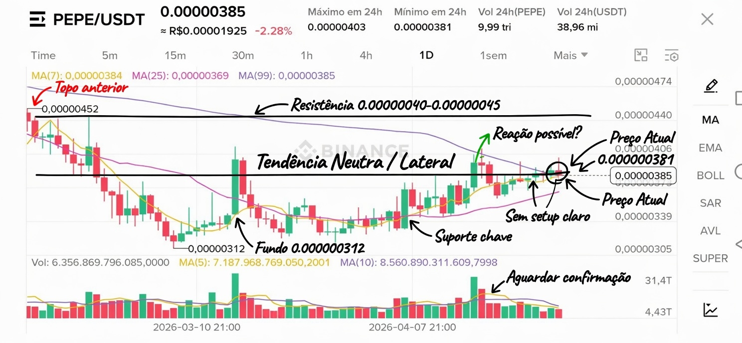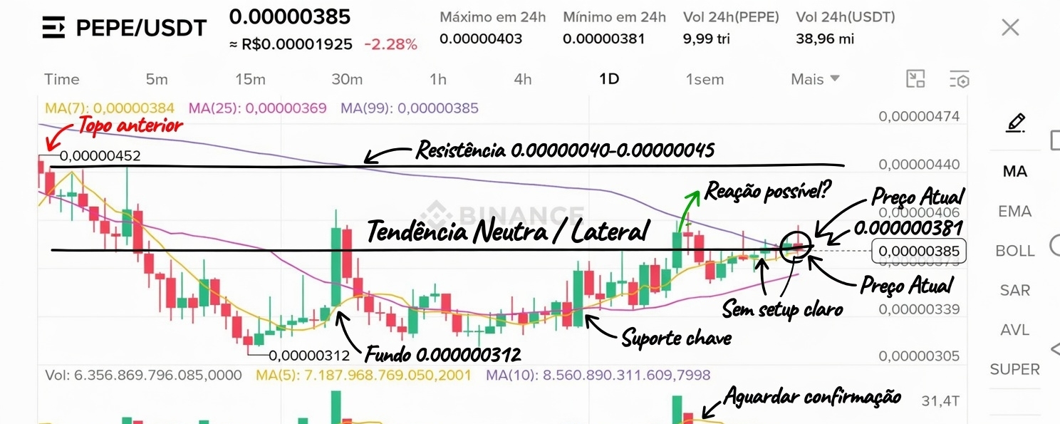 On the 1D chart of PEPE/USDT, the price is at 0,000000385 (-2.28% in the last 24h), close to the 24h low at 0,000000381 and far from the high at 0,000000403.