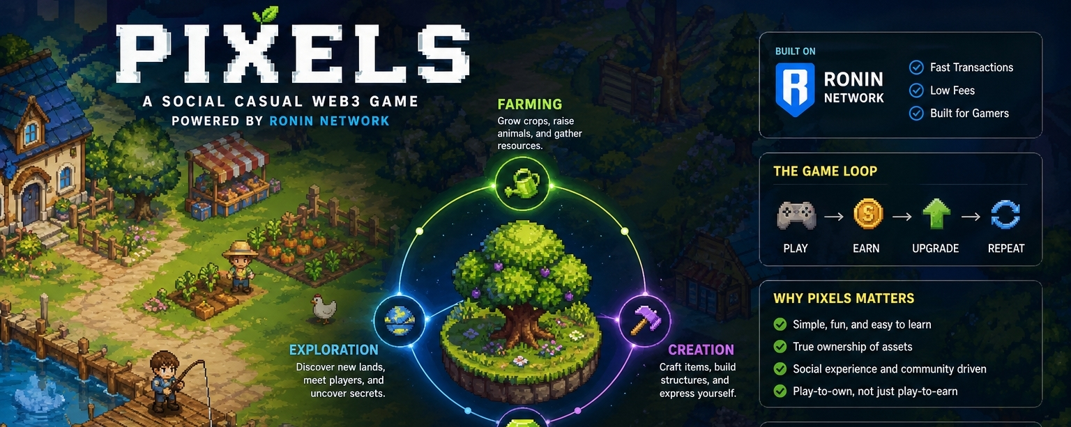 I’m looking at Pixels and trying not to treat it like a promise or a product, but like a place that exists between intention and attention. It calls itself a social casual Web3 game, built on the Ronin Network, and at first that sounds simple enough. Farming, exploration, creation — the kind of loop that should feel familiar even to someone who has never thought about blockchain at all. On paper, it’s just a game world. In practice, it’s something more fragile, because everything around it is tied to behavior that is constantly shifting.