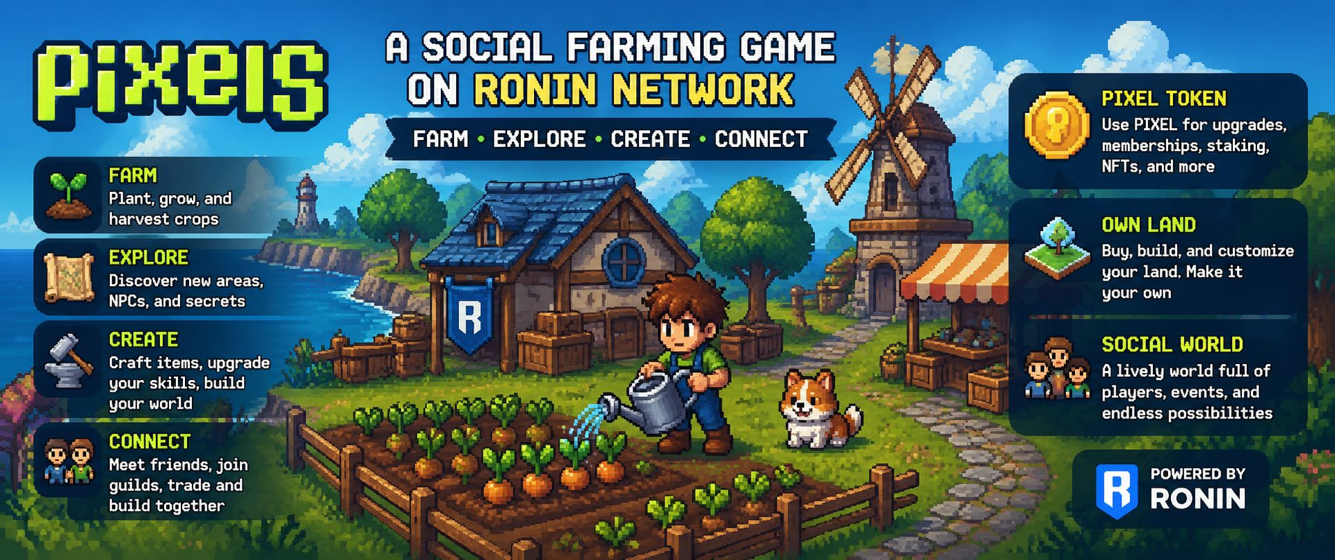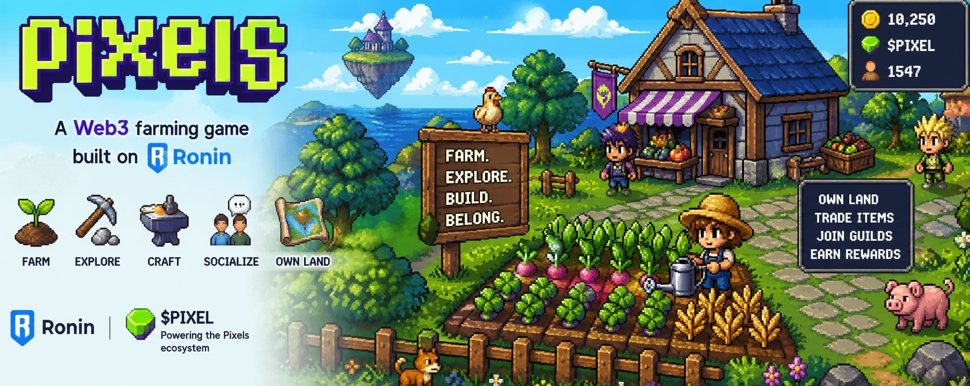 The interesting part is that Pixels is not only a farming game. It is also a Web3 game built on the Ronin Network. That means it is connected to blockchain features like digital ownership, tokens, land, NFTs, and an in-game economy that can stretch beyond the game itself. The main token, PIXEL, plays a role in the wider ecosystem and can be used for different game-related features such as upgrades, memberships, guild systems, NFT-related activity, and other utility inside the Pixels world.