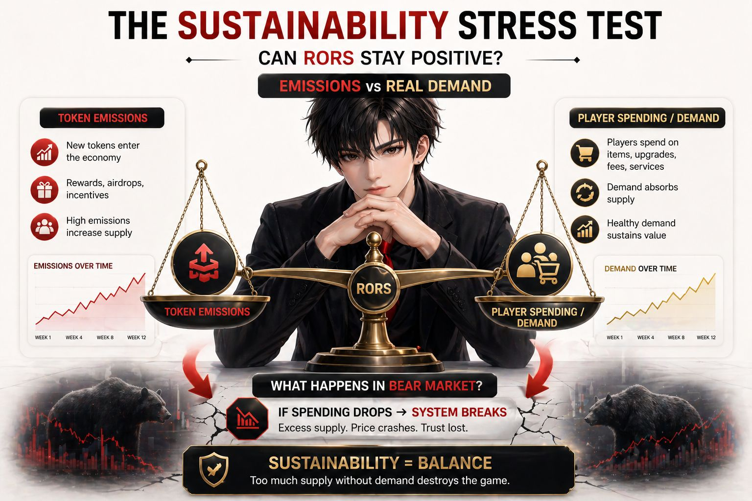 But let's be real it's not automatically sustainable just because the desIgn looks smarter. They're still emitting tokens, and sometimes those emissions probably outpace what the game is actually generating. RORS isn't some magic number that stays perfect forever. It moves with player behavior, token price swings, and how hyped everyone is.