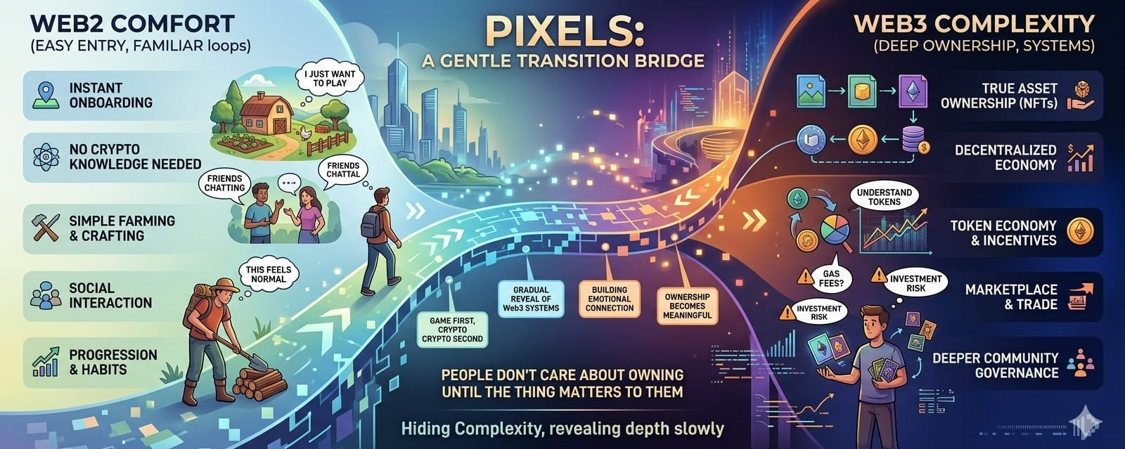 That is the gap Pixels is trying to stand in. On one side, there is Web2 comfort. On the other side, there is Web3 complexity. And somewhere in the middle, Pixels is trying to make the transition feel less painful.
