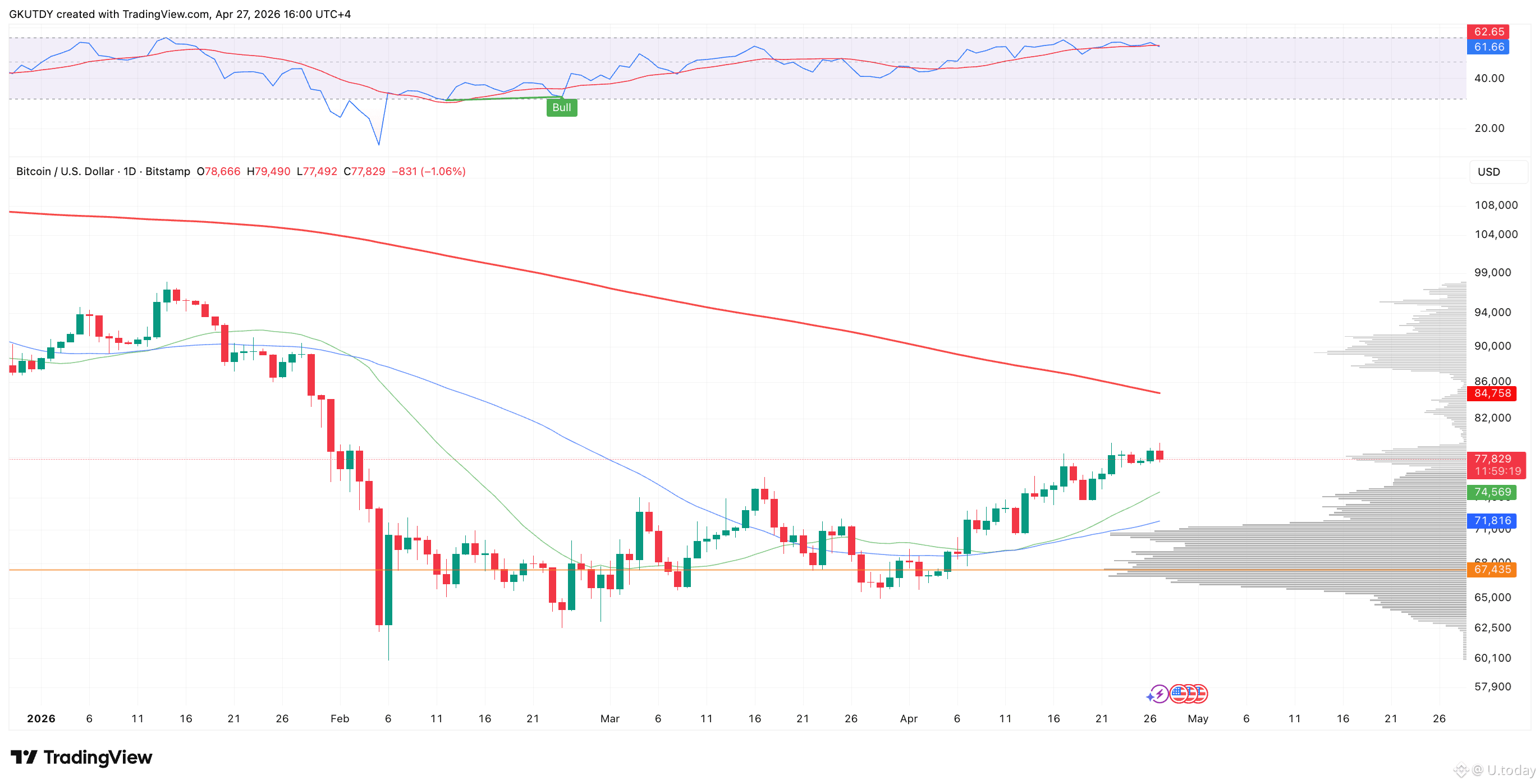 Wednesday, April 29: FOMC meeting and Powell press conference. The market expects rates to remain in the 3.5% to 3.75% range. Focus remains on commentary around persistent inflation and potential upward revisions to 2026 PCE forecasts.Thursday, April 30: U.S. GDP preliminary data for Q1 2026 and March PCE inflation. GDP is projected to grow around 2.2%. Core PCE is expected to rise to 3.2% from 3.0%, reinforcing hawkish expectations.Bitcoin remains within the $77,000 to $79,500 range. A break above $79,510 is required to remove bearish pressure from the futures market.