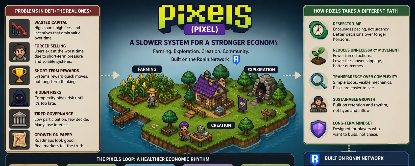 Pixels doesn’t solve all of that, but it exposes some of it more clearly. The simplicity of its loops makes it harder to hide structural weaknesses. When something breaks, it becomes visible faster. That transparency isn’t perfect, but it’s better than systems where complexity is used as a shield.
