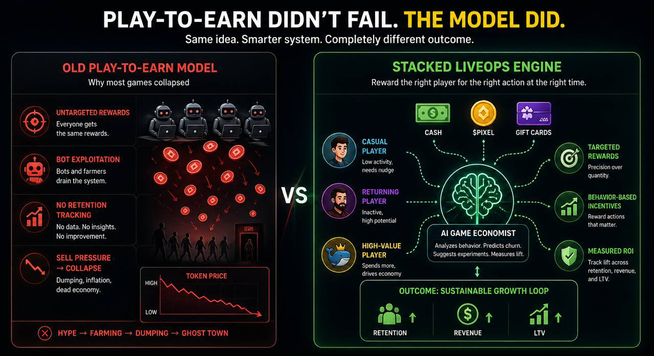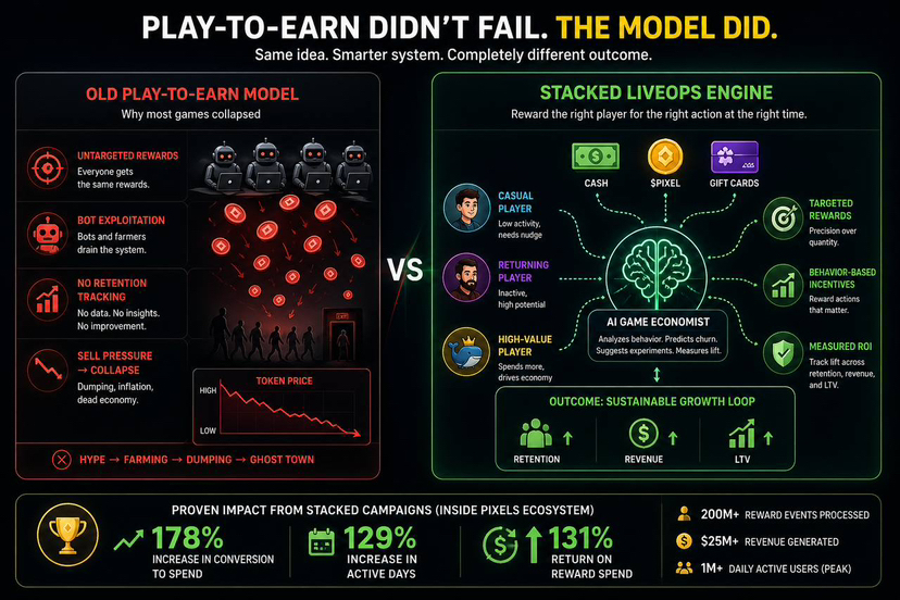 Play-to-earn died because the model was broken from day one. Tokens were thrown at users with zero control, zero targeting, and zero understanding of player behavior. Bots came in first, real players came in late, and the economy collapsed even faster. That cycle repeated across dozens of games. Hype → farming → dumping → ghost town.