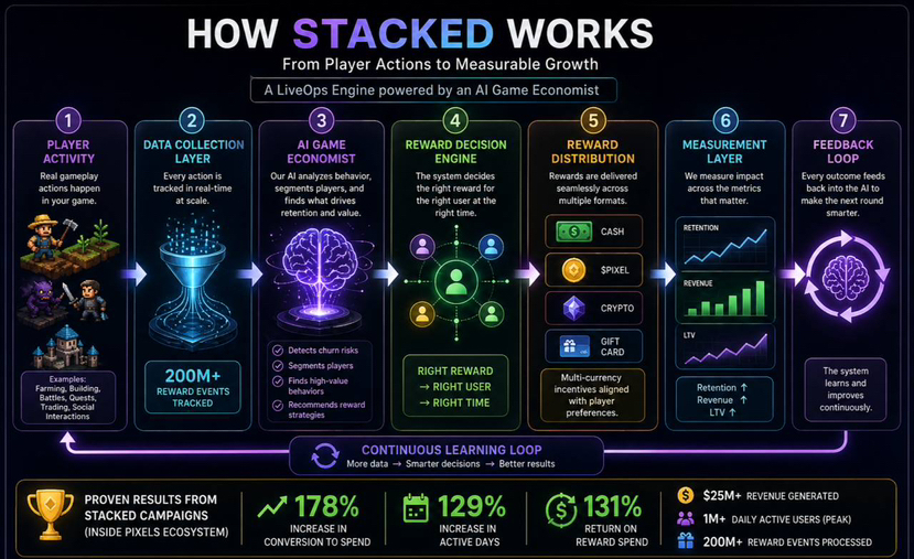 That’s operational intelligence anf we have proof with real numbers. When Pixels used Stacked to re-engage inactive players, they saw: