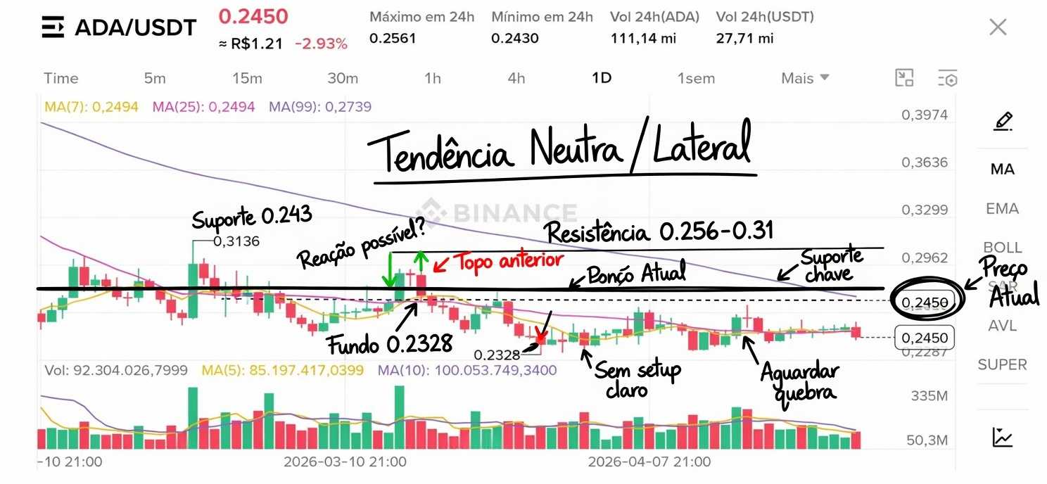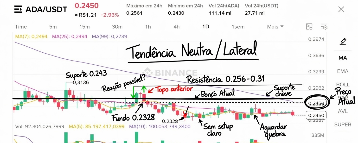 On the 1D chart for ADA/USDT, the price is at 0.2450 (-2.93% in 24h), close to the low of 0.2430 and far from the high of 0.2561.