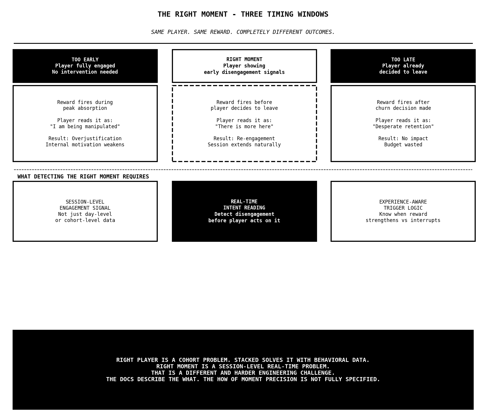 the behavioral data layer tracks what players do.it can identify who is at risk of churning.it can surface the right player. what is harder- what i cant see specified clearly in the docs -is how the system identifies the right moment within a session.not just which day or which stage of a player journey.but the precise moment when a reward signal strengthens the experience rather than interrupting it
