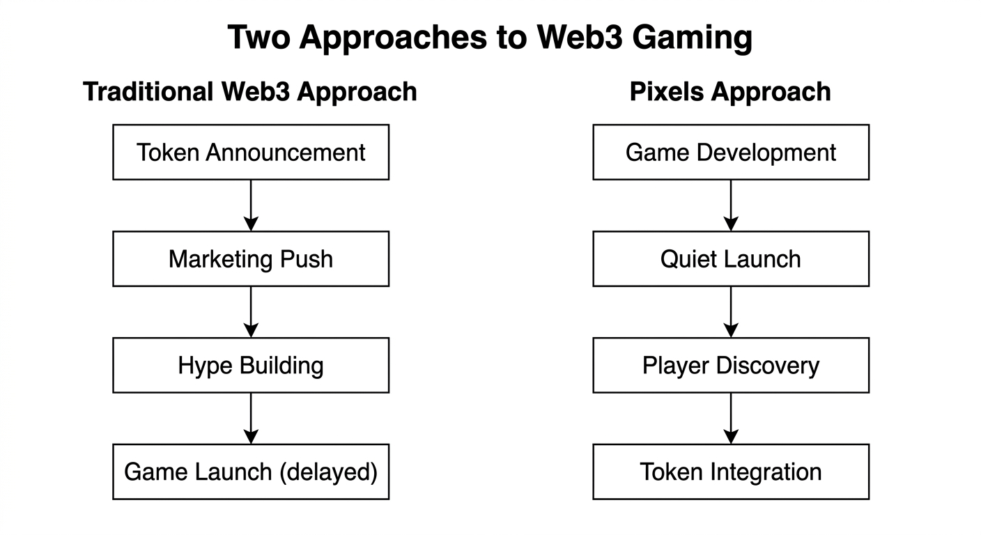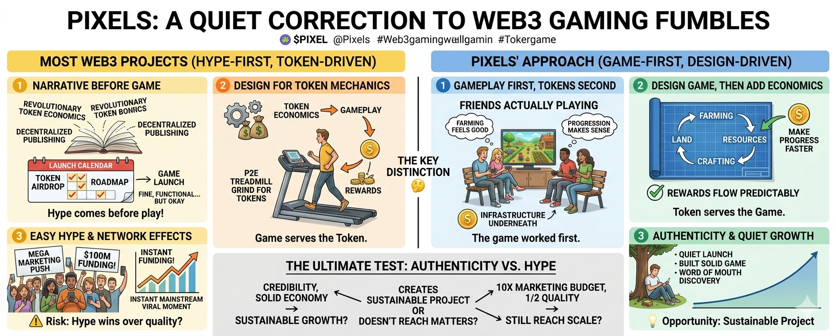 the downside of removing the easy hype is that you don't get the hype. pixels grew slowly. it didn't have the network effect viral moment that could've made it mainstream instantly. instead it had to earn players one at a time through people actually enjoying it. that's slower. that's riskier. that's not how most crypto projects operate because they can't afford to wait.