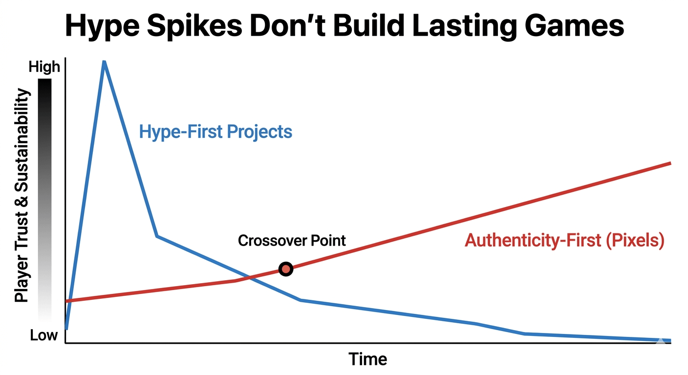 does building on authenticity instead of hype create a more sustainable project that survives long-term, or does it just mean pixels never reaches the scale where it actually matters?