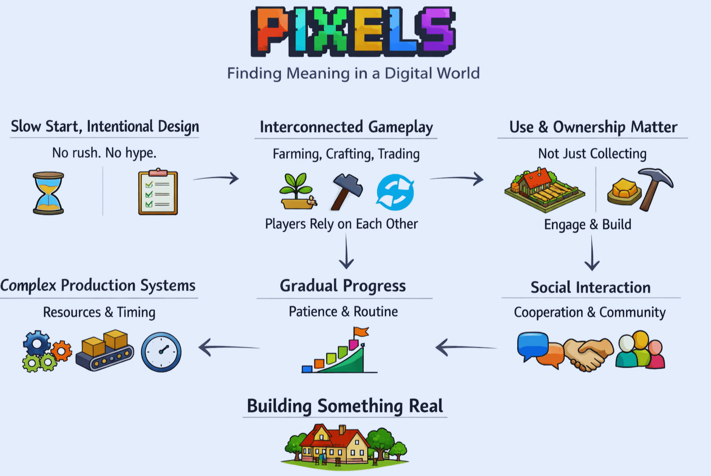 Pixels seems to be trying to break that loop, but not directly. Instead, it turns the loop itself into the experience. Farming, crafting, upgrading, trading, social interaction everything is designed so that repetition itself slowly becomes a habit. Here, the reward is not just tokens, but the act of returning itself.