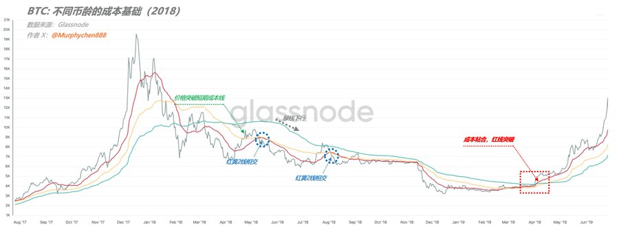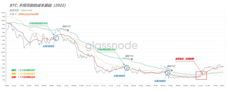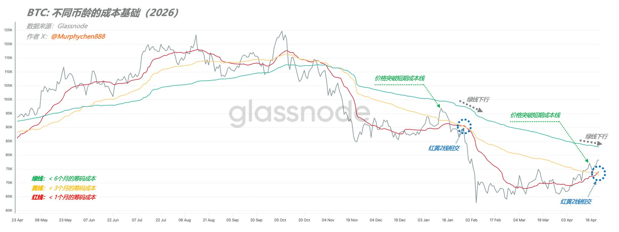 The red/green/yellow lines represent the cost bases for ultra-short-term and medium-term holding groups (see notes in the chart). Currently, with BTC's price bouncing back, the red line is moving up and crossing the yellow line (Chart 1).