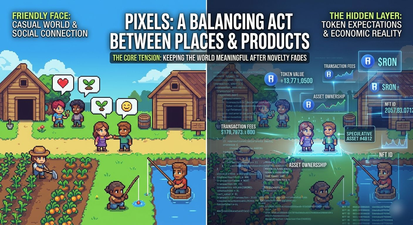 I’m watching Pixels the way I usually watch projects that sit somewhere between a game, a social layer, and a blockchain experiment. It is easy to look at something like this from a distance and reduce it to a simple story about farming, exploration, and creation on Ronin, but that is not really what I am seeing. I am seeing the same tension I keep seeing across this industry: a product wants to feel casual and welcoming, while the infrastructure underneath still carries the weight of crypto assumptions, token expectations, and the constant pressure to justify itself beyond speculation. At first it sounds simple. A world to enter, tasks to do, things to build, people to meet. But reality is different. The second a project tries to make “social” and “Web3” sit in the same chair, the room changes.