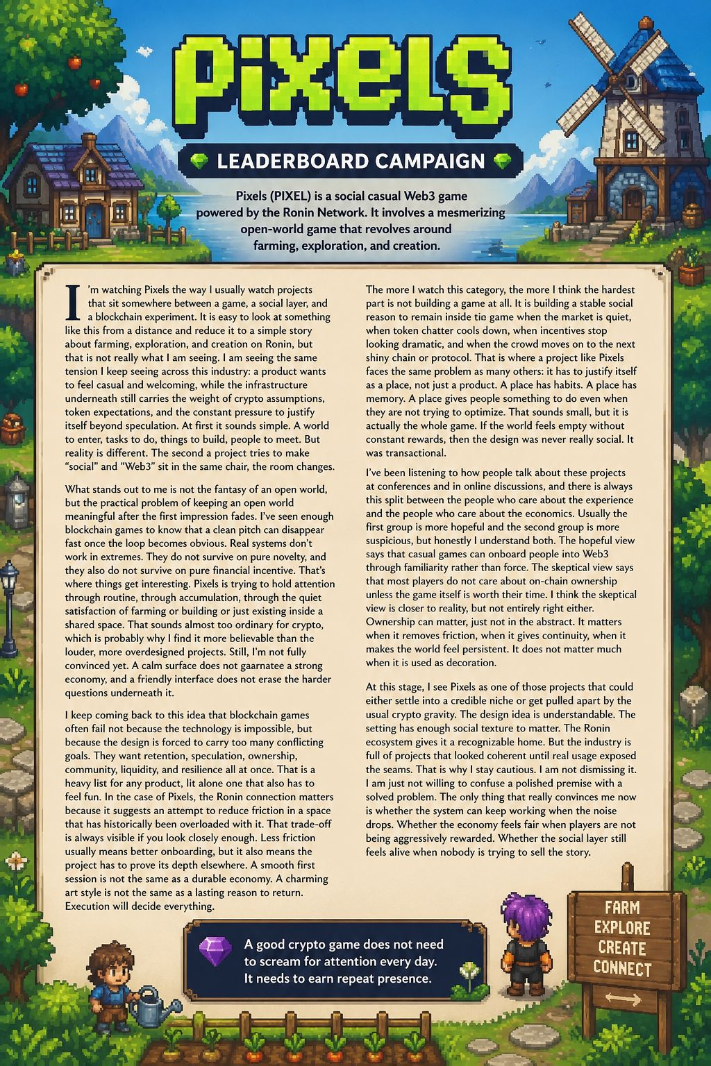 That’s where things get interesting for me. Not in the pitch, but in the maintenance. Not in the launch, but in the months after. Not in the promise of a lively open world, but in the discipline required to keep one from becoming hollow. I keep coming back to this idea because it seems to separate serious projects from everything else. A good crypto game does not need to scream for attention every day. It needs to earn repeat presence. It needs to make the ordinary parts of participation feel worth returning to. That is harder than it sounds, and probably why so few teams really get there. Pixels may be aiming in the right direction, but the industry has taught me to respect ambition only after it survives contact with reality.