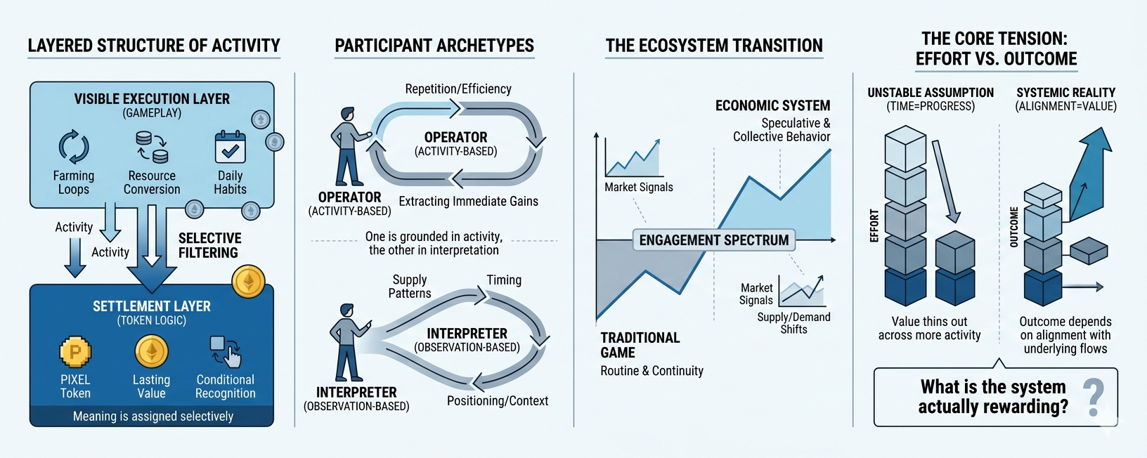 Pixels presents itself as a world where activity is visible and effort feels tangible You move you act you receive something in return The feedback is immediate enough to keep you engaged and just delayed enough to suggest that something deeper might be accumulating beneath it