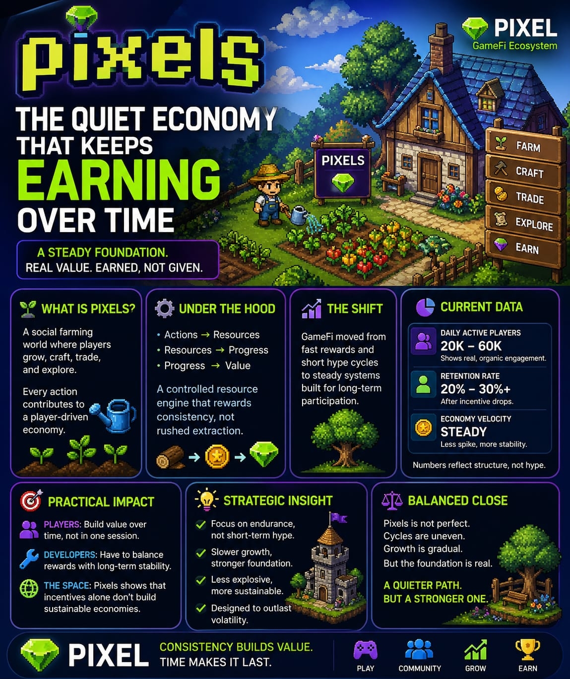 Pixels represents a quieter shift away from that approach. Instead of maximizing short term yield, it distributes interaction over time. Not fully new, but noticeably more restrained.