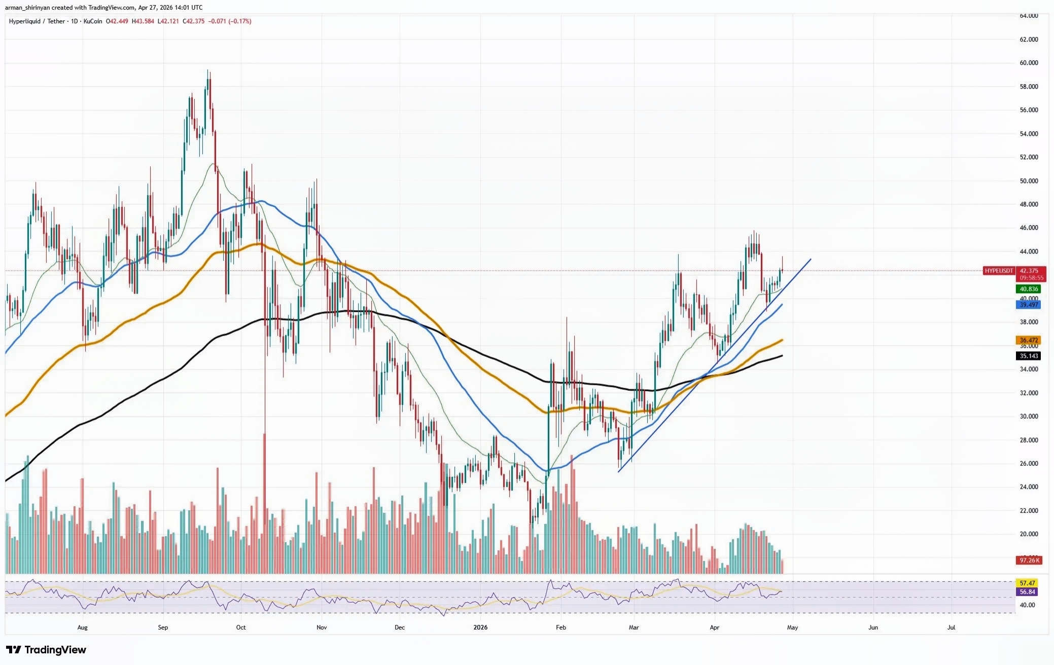 This rally pushed HYPE from the mid-$20 range to above $40, forming a strong upward trend with consistent higher highs. Analysts note that traders are increasingly using leverage again — a sign of growing confidence, but also rising risk.