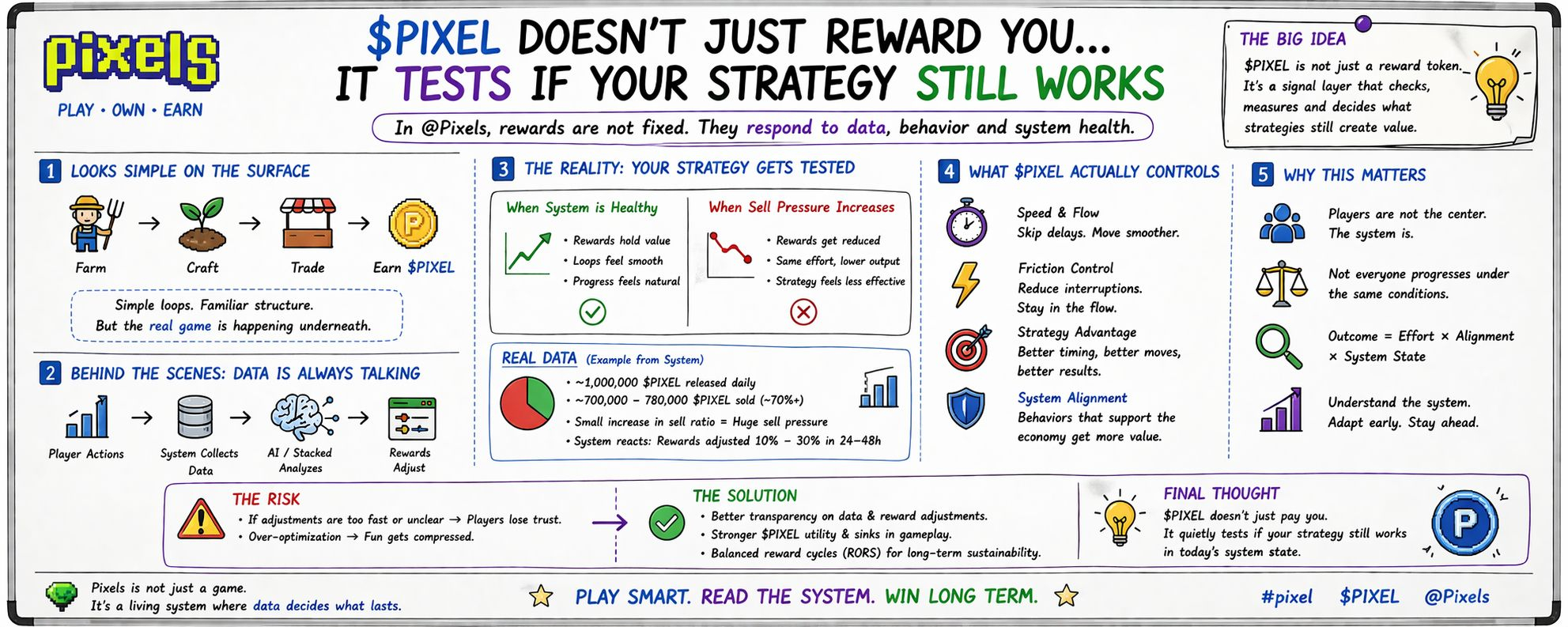 Inside @Pixels , progression still looks simple on the surface. You farm, craft, trade, repeat. But under that, there’s a layer where behavior gets measured. Whitepaper talks about data-driven rewards and RORS, meaning rewards are treated like capital, not giveaways. So when ~1M pixel enters daily and a large portion gets sold, the system doesn’t ignore it… it reacts.