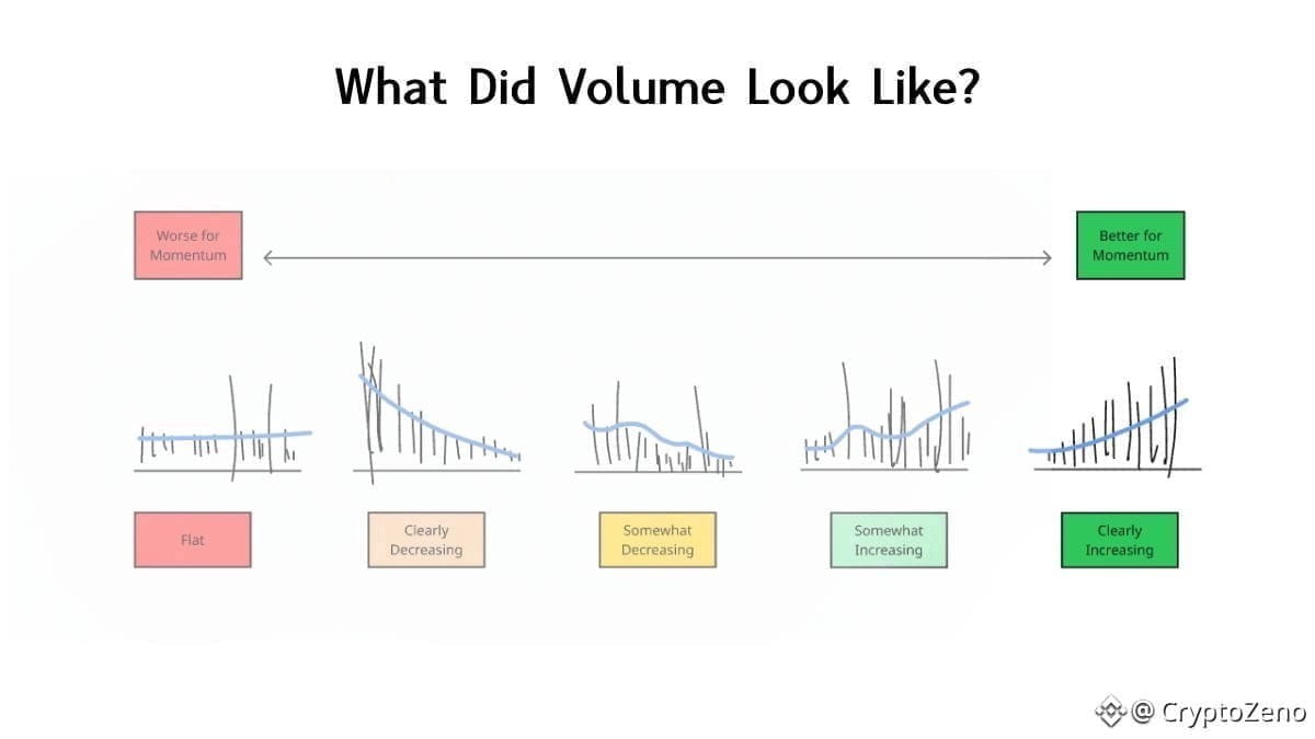 Volume should build gradually to confirm sustained participation, not remain flat or spike from exhaustion.