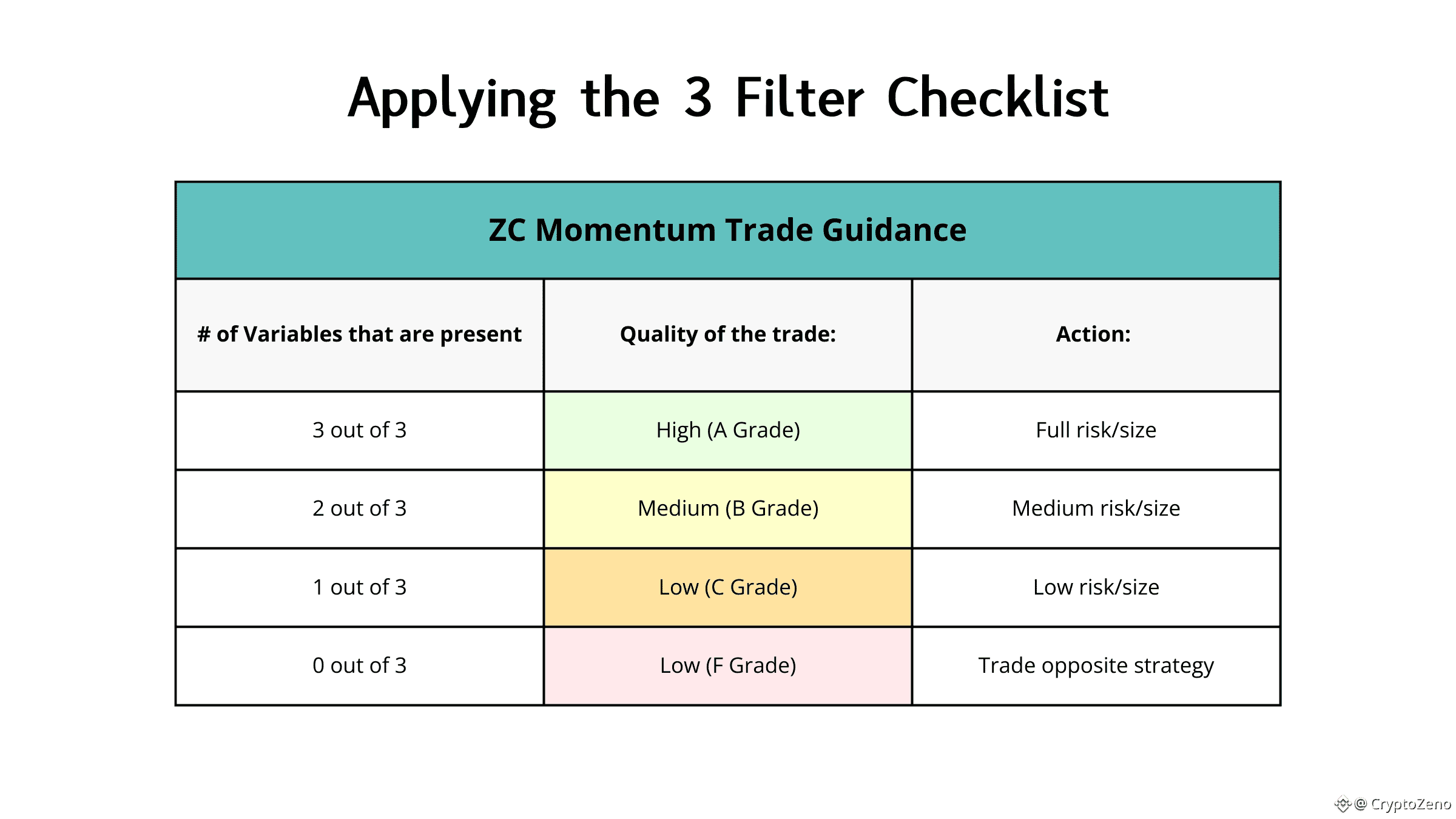Check all three filters before entering, allocate risk and size accordingly