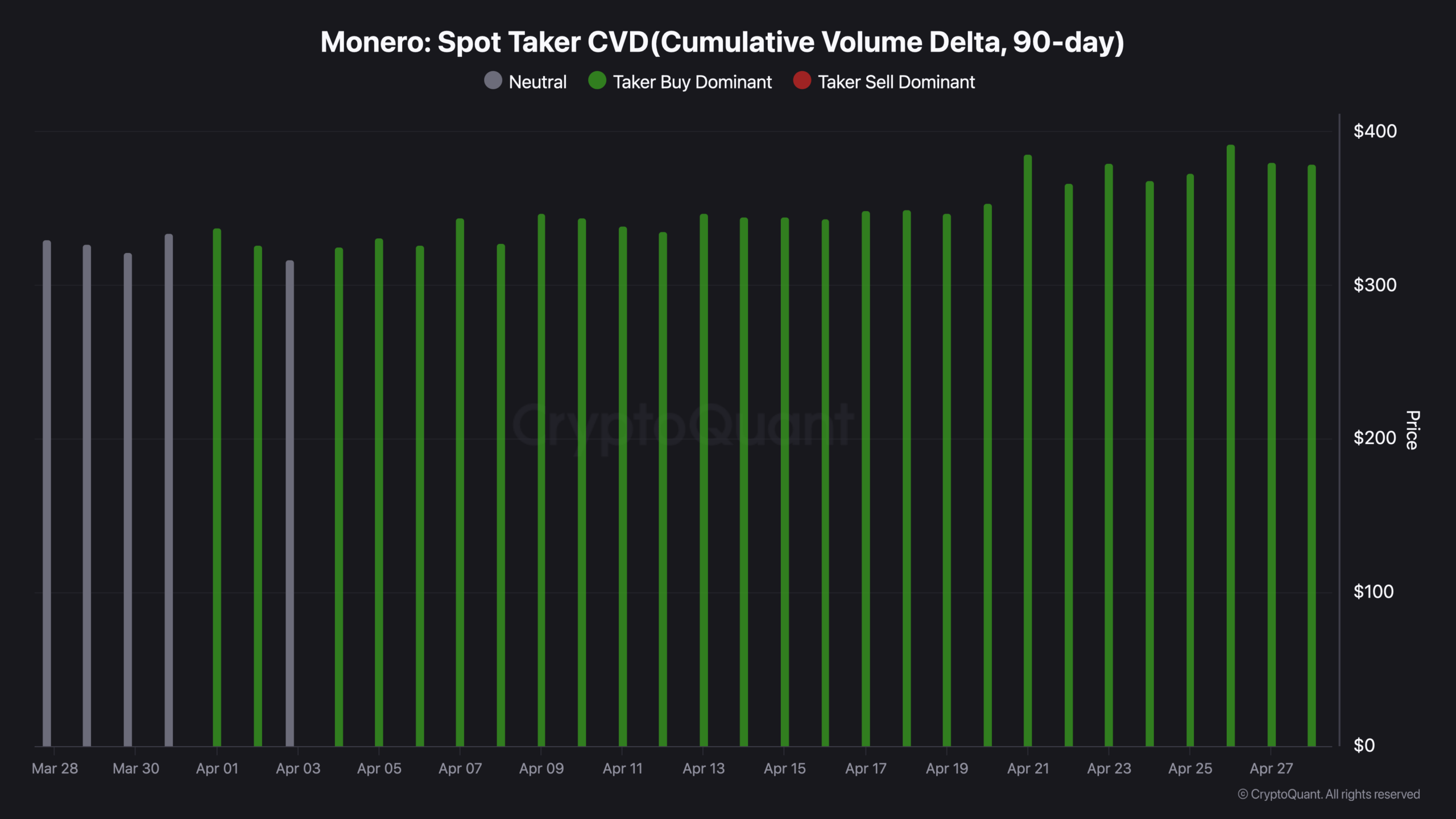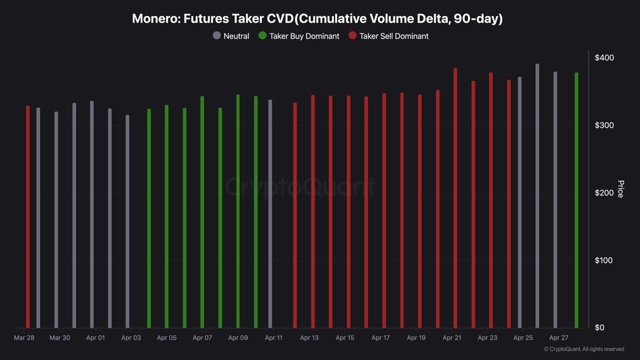 Monero climbed from $320 to $405 between April 7 and April 26 with spot takers buy dominant every single session and retail futures activity registering neutral for the entire move.
