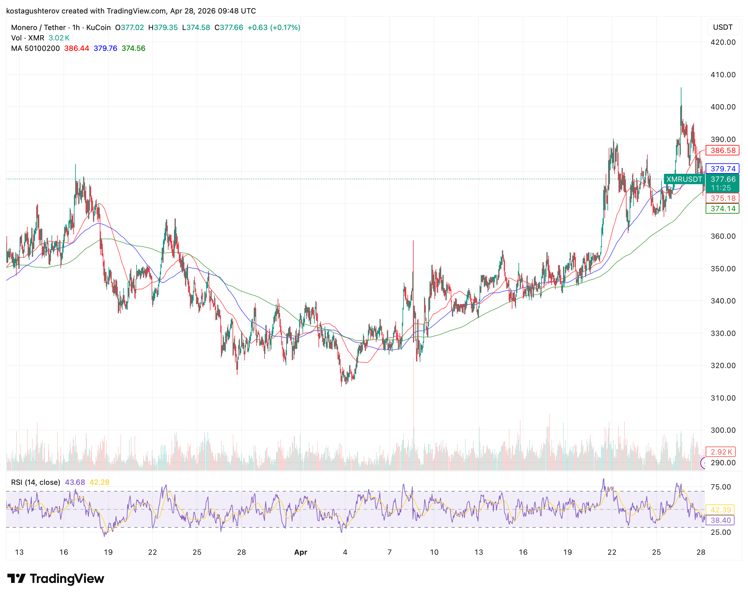 At $377.66, XMR is sitting in the only part of the MA stack where the pullback is still constructive. The 200MA at $374.56 is $3.10 below. The 100MA at $379.76 is $2.10 above. The 50MA at $386.44 is $8.78 above. Below $374.56, the structure breaks. Above $379.76, it resumes.
