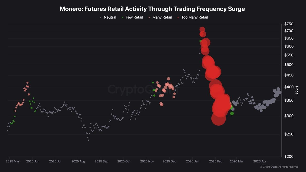The most significant fact about Monero's April rally is not that it happened. It is who was absent while it did. Spot takers drove price from $320 to $405 with the futures retail activity chart showing neutral grey for every single session. No pink dots. No red dots. The crowd that drove the January blowoff to $750 was not present for any of it.