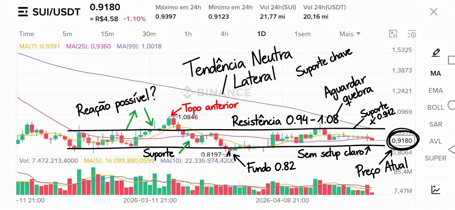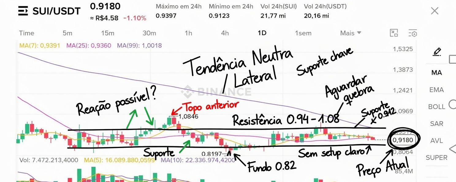 On the 1D candlestick chart for SUI/USDT, the price is at 0.9180 (-1.10% in 24h), very close to the low of 0.9123 and far from the high of 0.9397.