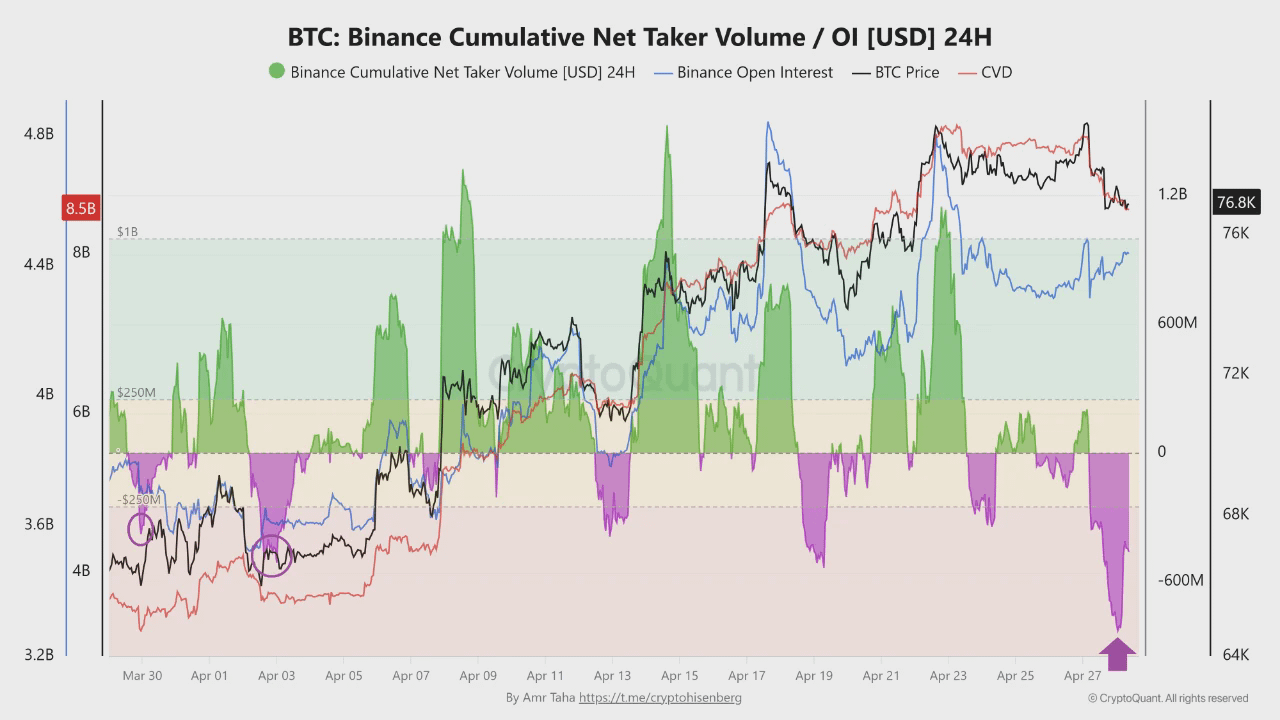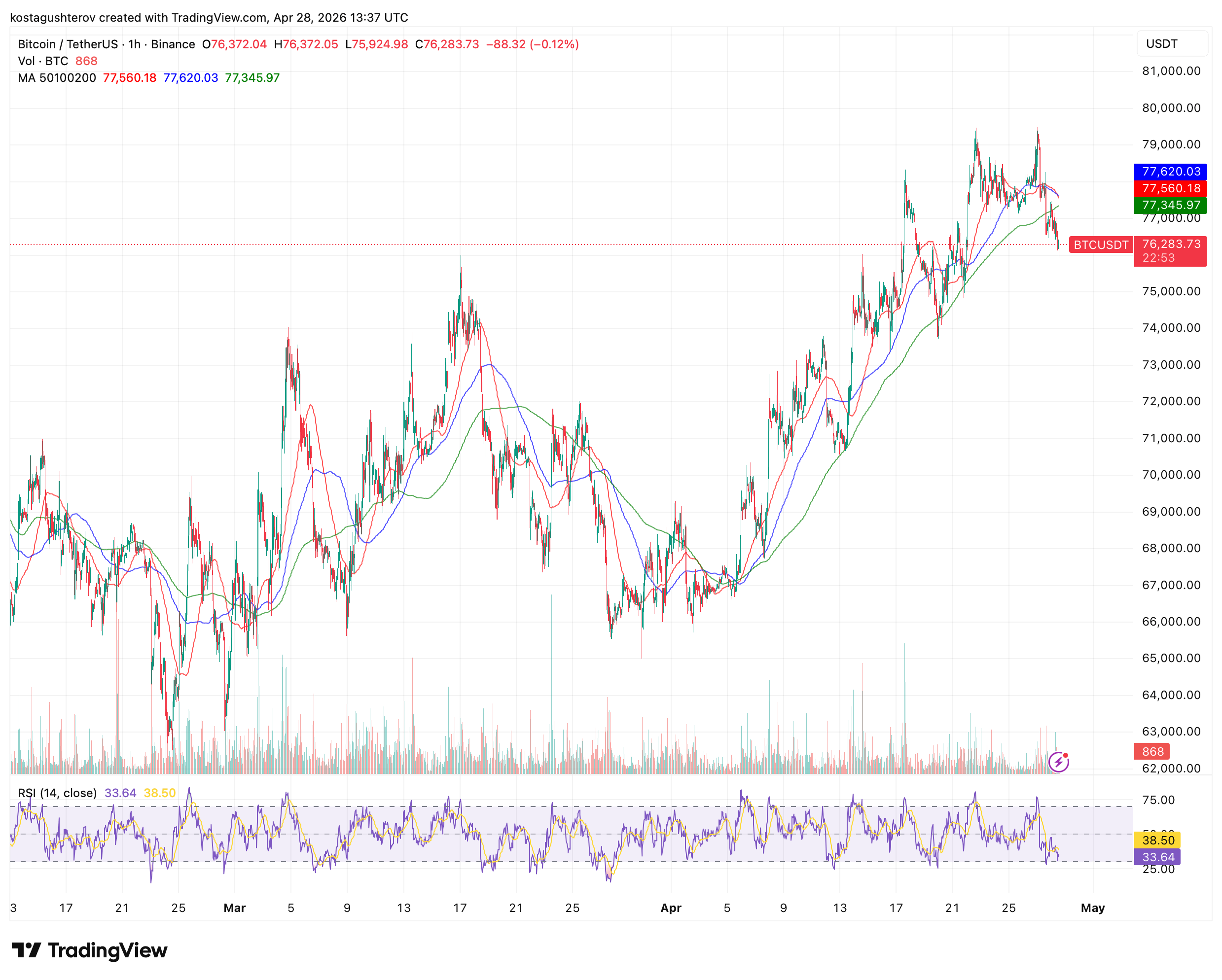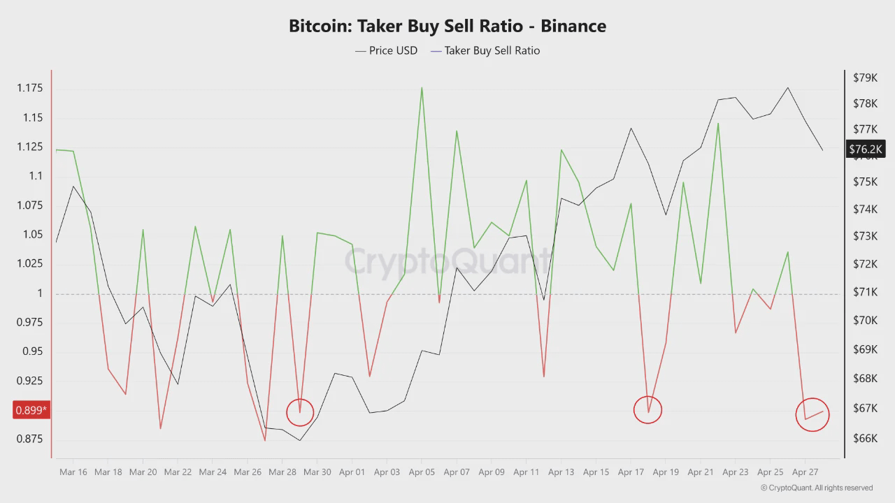 RSI at 34.45, Binance net taker volume at -$828M, and price below a compressed MA cluster at $77,335 to $77,632 are not three independent buy signals. They are the same signal, a 4.3% pullback from the April 24 peak of $79,800, expressed in three different metrics simultaneously. Read as one signal they are informative. Read as three independent confirmations they overstate the case. A sharp short-term selloff produces all three conditions by definition, and treating their convergence as unusual overstates the evidence for a recovery.