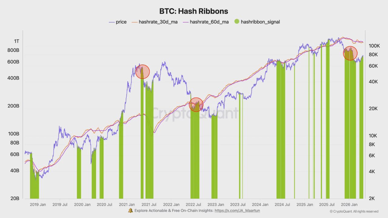 The miner stress indicator (Hash ribbons) triggers a buy signal when the short-term hashrate average crosses back above the long-term average after a period of compression, the moment miner recovery begins after genuine capitulation.