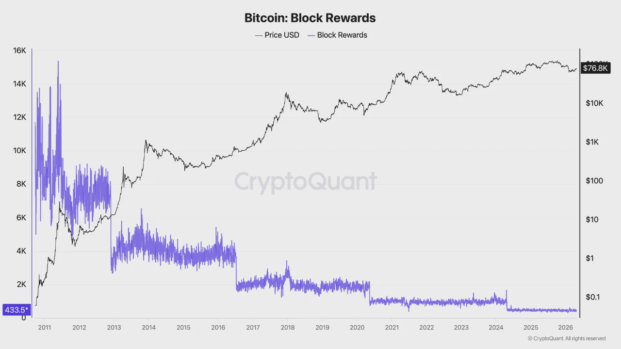 At 3.125 BTC per block and $76,800 price, miners collectively earn approximately $33.6M per day in block rewards before costs. At the 2024 cycle peak that figure exceeded $100M per day. Two-thirds of peak reward revenue has been removed by the halving while energy costs, equipment financing, and infrastructure overhead have not adjusted proportionally.