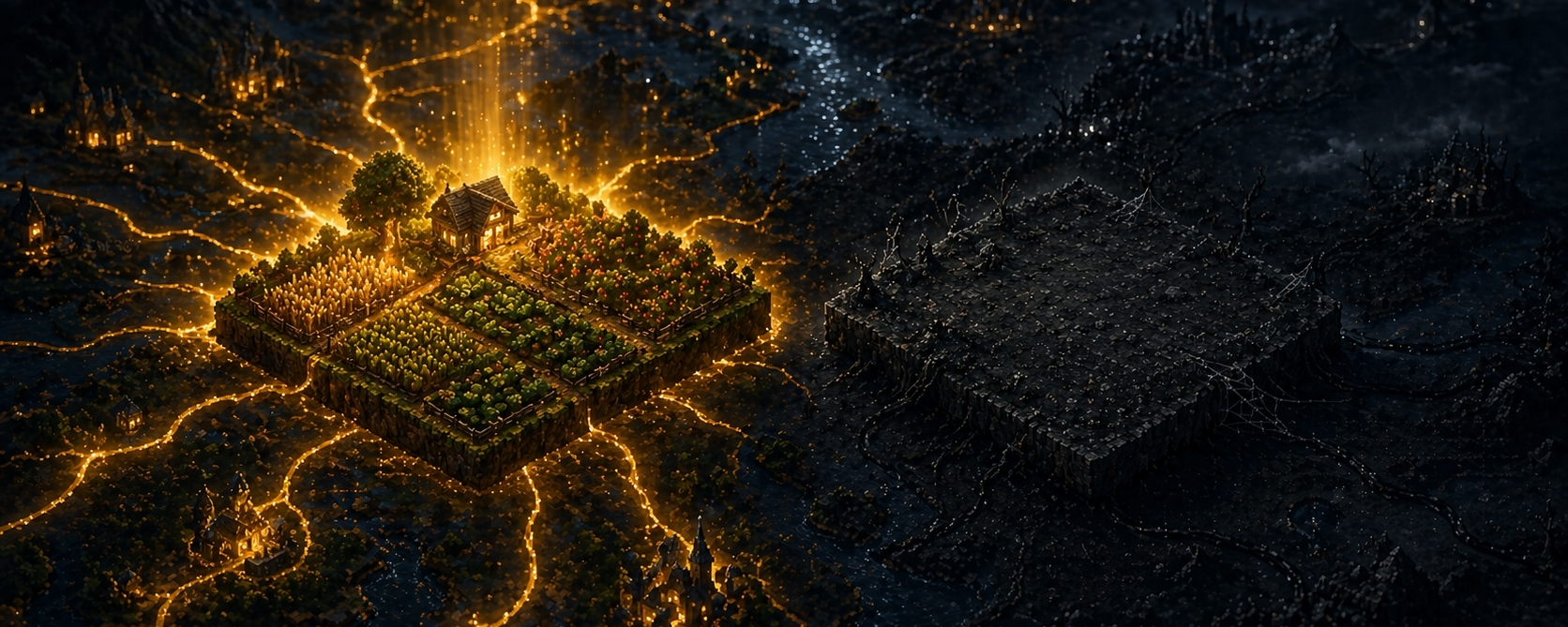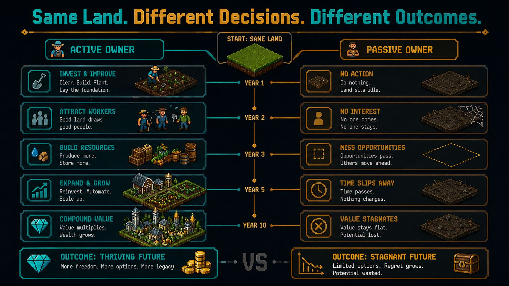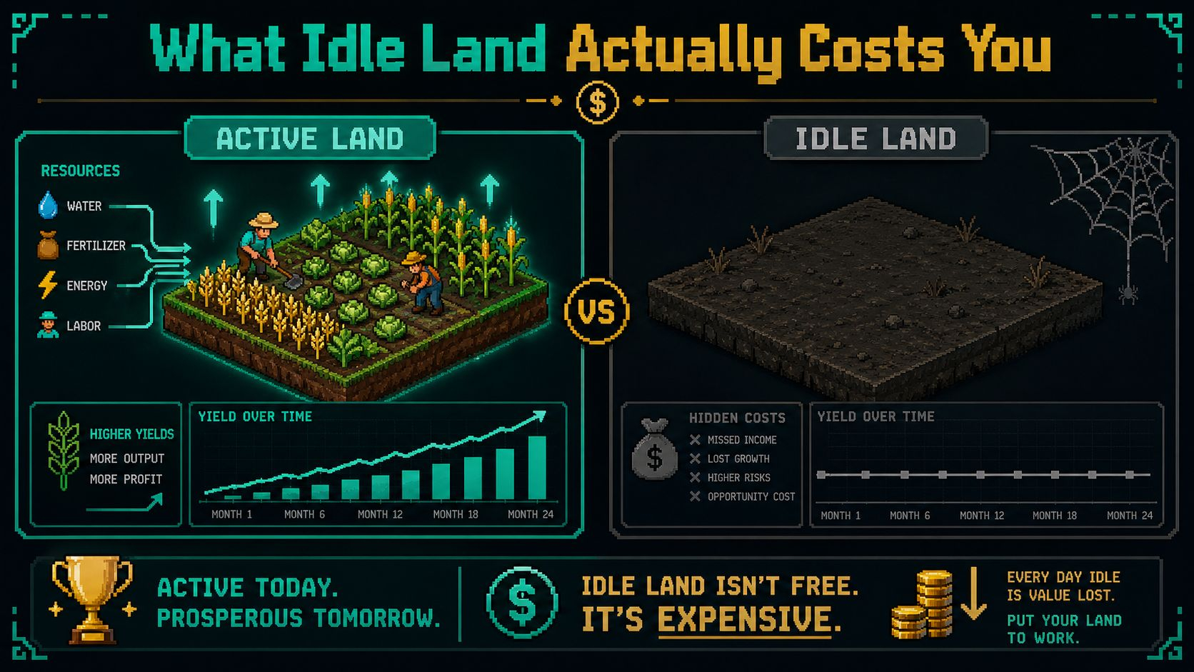 What I hadn't expected was how quickly idle land starts feeling like a drag rather than a neutral position. It's not that nothing happens when your land sits empty. It's that everything around it keeps moving while yours doesn't. The opportunity cost becomes visible in real time. Other plots are accumulating history — worker patterns, resource flows, a reputation for reliability. Mine was accumulating nothing. And in a system where the land's value is partly defined by what it consistently does, doing nothing is its own kind of loss.