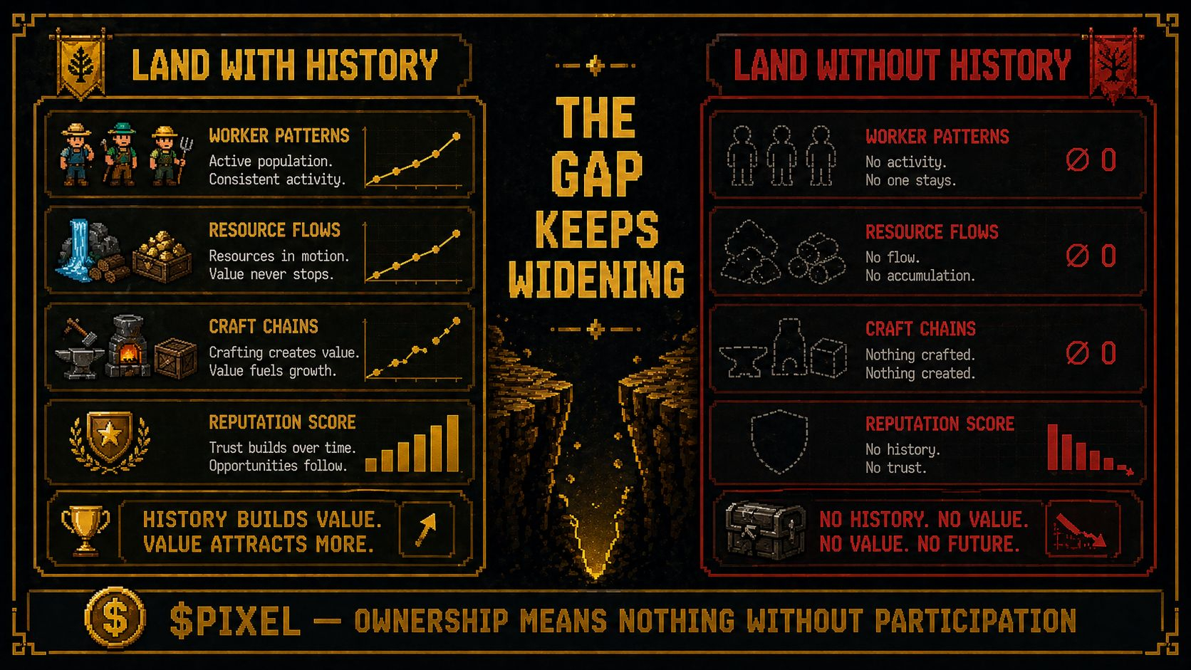 There's a version of this where Pixels land NFTs slowly sort themselves into two categories — plots with economic history and plots without it. And the gap between those two categories keeps widening the longer one owner stays active and another stays idle.